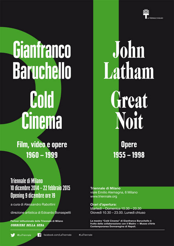 La mostra di Baruchello è inoltre posta in relazione con la prima antologica intitolata Latham: Great Noit dedicata da un’istituzione italiana all’artista John Latham (Livingstone 1921- Londra 2006), realizzata da Alessandro Rabottini in collaborazione con la John Latham Foundation.