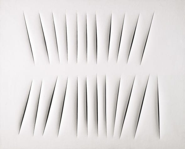 È il 1965 – l’anno prima del premio che Fontana riceverà alla XXXIII Biennale di Venezia e che lo consacrerà fra gli artisti più importanti ed influenti di sempre. L’opera che Shunk ritrae è fra le più importanti realizzate dall’artista: uno dei soli due lavori bianchi di Fontana con un così grande numero di tagli.
