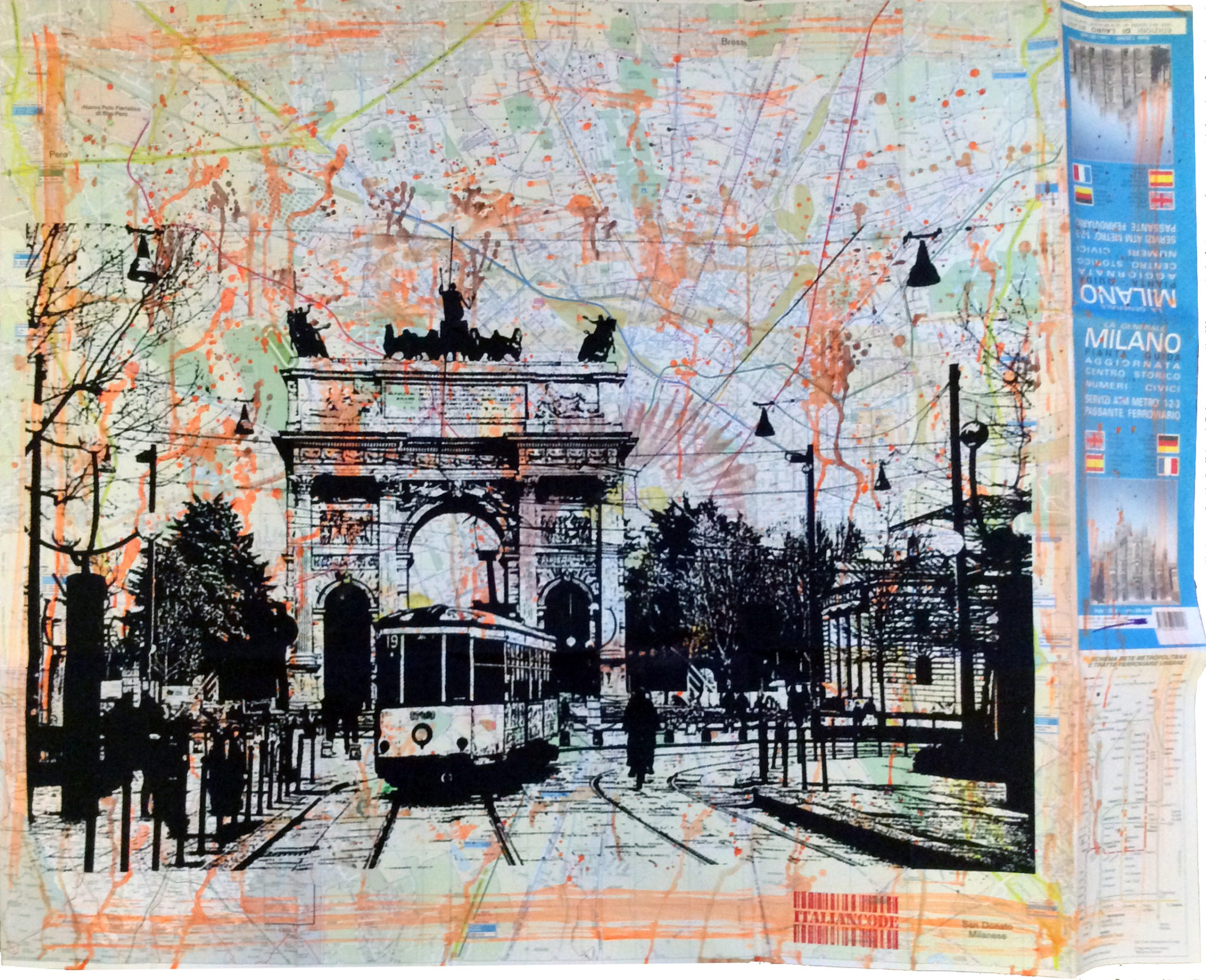 Il Duomo, la Torre Velasca, il tram e tanti altri soggetti si stagliano al centro delle piantine che fanno da sfondo con quel classico reticolato di indicazioni stradali.