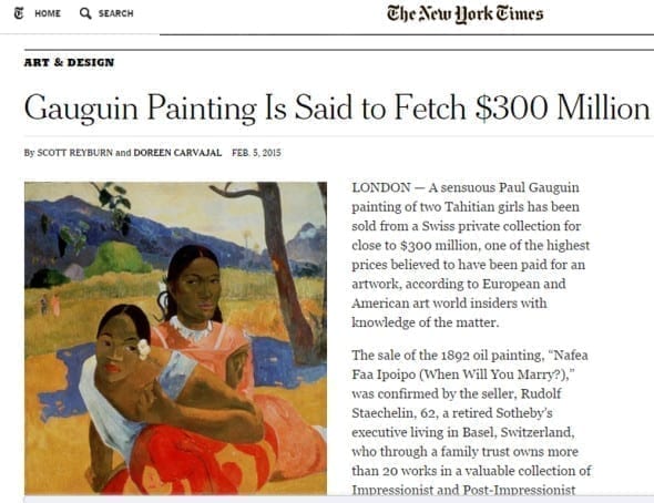 Secondo alcuni media americani, il quadro di Paul Gauguin dal titolo «Nafea Faa Ipoipo (Quando ti sposi?)», sarebbe stato acquistato per 300 milioni di dollari da un consorzio dei musei del Qatar.