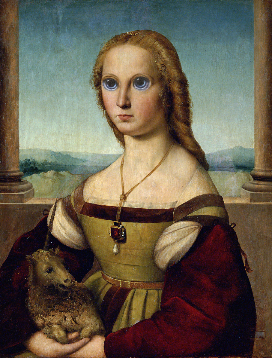 Son tornati alla ribalta conquistando le sale cinematografiche di mezzo mondo gli occhioni sproporzionatamente giganti dipinti da Margaret Keane sul viso di tristi trovatelli tra gli anni Cinquanta e Sessanta. Tim Burton con il suo Big Eyes li ha riportati in auge e su pellicola. Lasciando in santa pace i “piccoli” pop sulla tela della pittrice, abbiamo provato a a trasportare quei big eyes su alcuni capolavori della ritrattistica mondiale, da Raffaello (Dama con occhi celesti persi per nella purezza verginale del liocorno) a Klimt (una Giuditta dagli occhi nerissimi molto poco erotica), da Leonardo (con la sua Monna Lisa senza più ambiguità nello sguardo) ad Andy Warhol (con la Marylin colta a mirarsi lo sparo in fronte “regalatole” dalla performer Dorothy Podber). Ritratti rivisitati con occhioni planetari. L’effetto? Eccolo qua.
