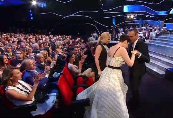 A metà della lettura Conti viene interrotto perchè sembra ci sia stato un problema tecnico che lo costringe a leggere la rimanente classifica da un foglietto. Nei primi tre posti, ancora provvisori