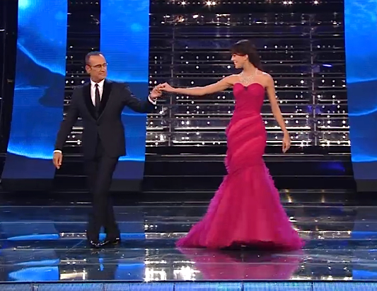 La gara di Sanremo 2015 prosegue con altri 4 big ma non prima di far scendere la fatidica scala all’elegantissima Rocìo Muñoz Morales