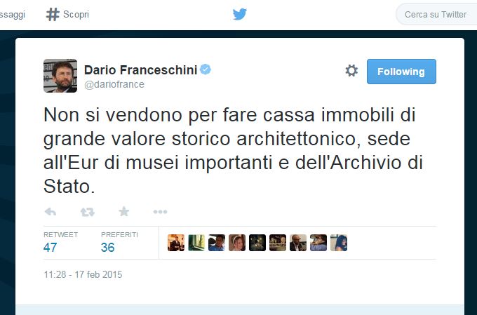 Lo ha twittato il ministro dei Beni Culturali Dario Franceschini in seguito ad una dichiarazione rilasciata all’Ansa nella quale ha affermato che la vendita dei palazzi storici dell’Eur “non è praticabile”.