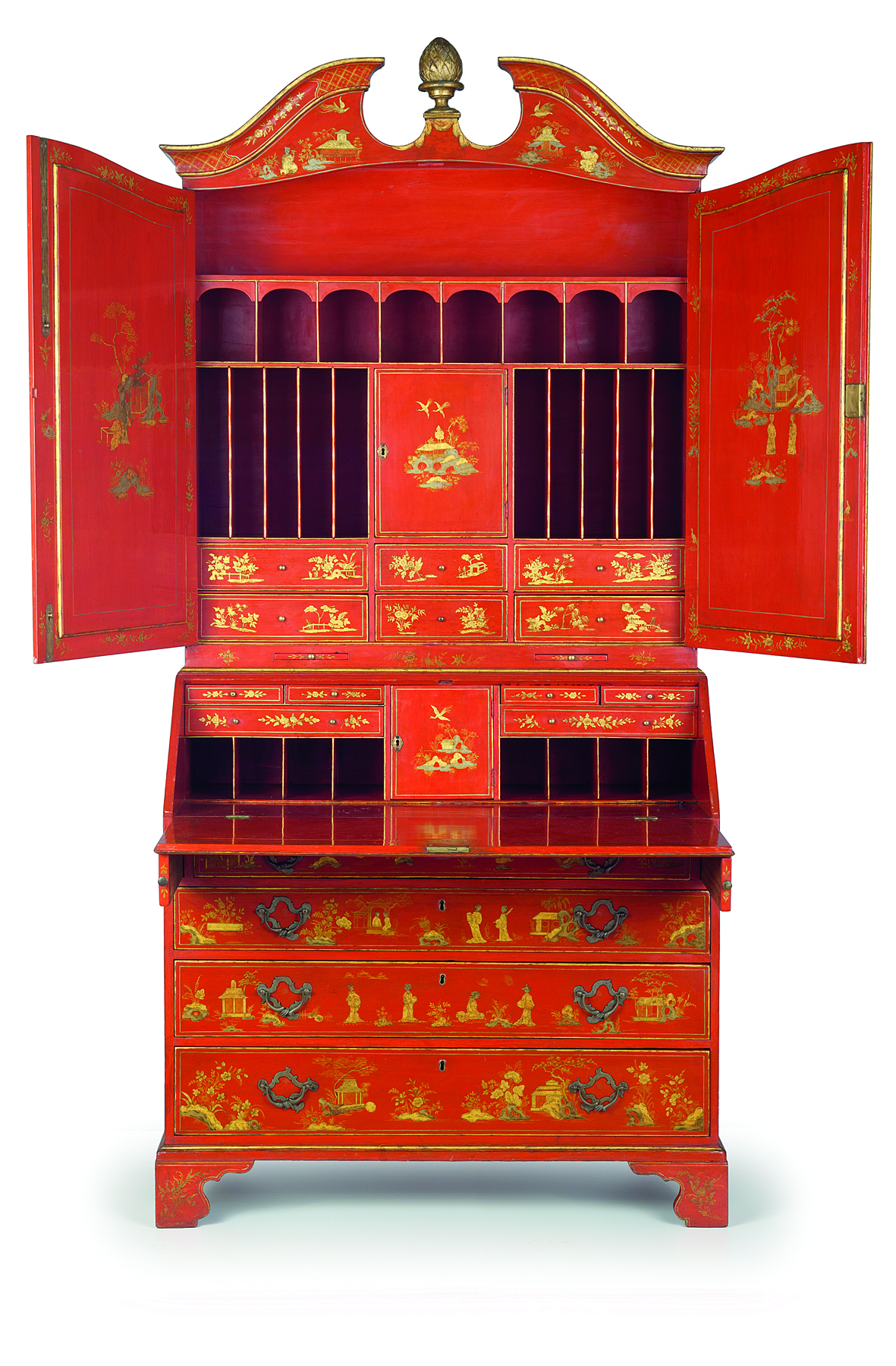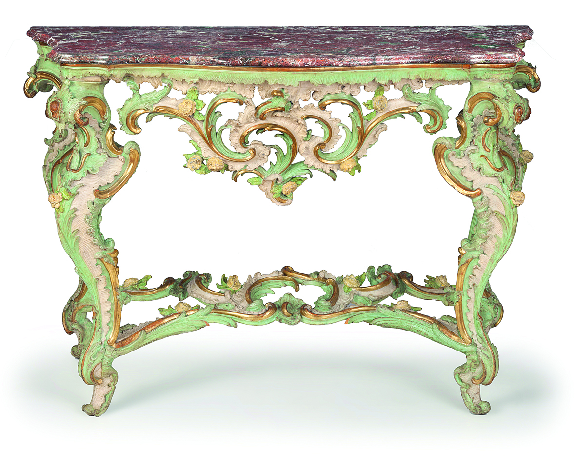 “Ho scelto pezzi di gusto internazionale, ci sarà un trumeau rosso inglese a chinoiserie, Giorgio III, è bellissimo, l’ho usato come immagine per gli auguri di Natale e me l’hanno già chiesto (lotto 289 stima 40.000 – 60.000 euro). Era di mio padre, come lo era anche lo scrigno del ’500 veneziano scolpito alla Sansovino. Ci sarà una specchiera da camino con una scultura che rappresenta il ratto di Proserpina. E poi una consolle lombarda a sfinge con un ripiano in marmo di breccia corallina”.