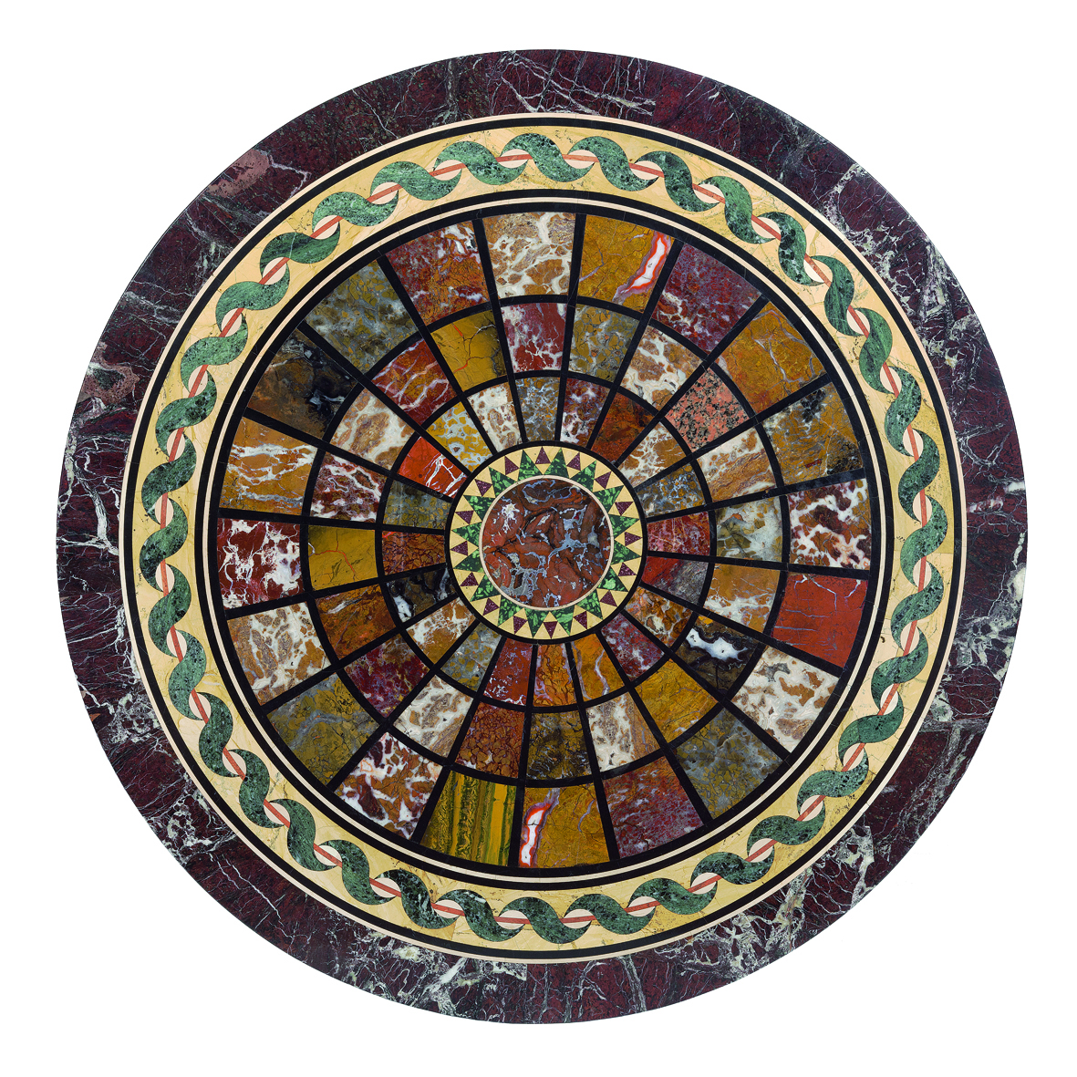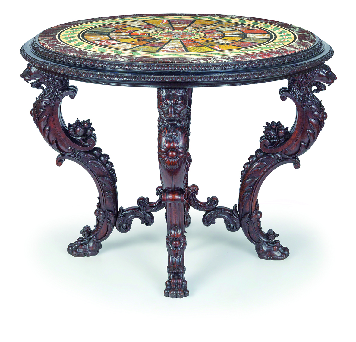 Proveniente da una dimora romana, un elegante quanto festoso piano in scagliola policroma del XIX secolo (lotto 631 stima 6.000 – 8.000 euro), un bracere circolare in bronzo del XIX secolo, con basamento tripartito su supporti in forma di fauni monopodi con zampe ferine (lotto 635 stima 3.000 – 4.000), uno splendido piano in marmi policromi probabilmente manifattura romana o fiorentina del XVII-XVIII secolo (lotto 655 stima 15.000 – 20.000 euro), e infine un severo busto di imperatore in vari marmi che si impone per la suntuosa eleganza della lavorazione (lotto 662 stima 6.000 – 8.000 euro).