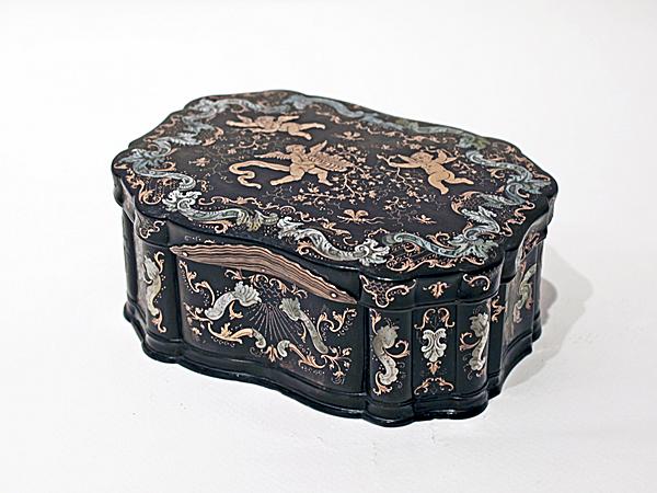 Piqué-work gold and mother-of-pearl inlaid, the top with a scene of putti, flowers and butterflies overall with scrolling foliage and sprays, a tortoiseshel tray inside
