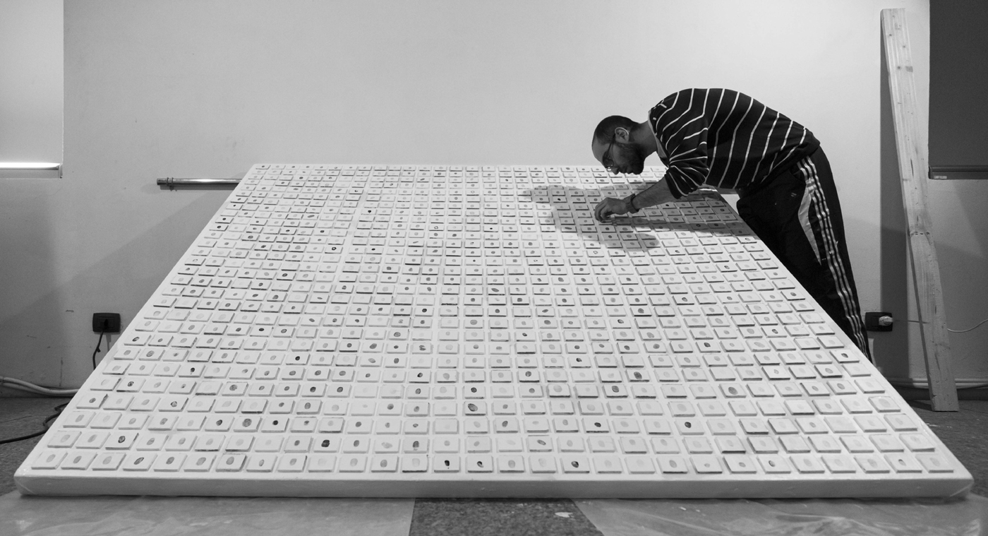 È una tela che ho fatto io a mano, 196 per 196 cm. Un quadrato perfetto con all’interno apposti un tot di quadratini perfetti, cartoncini tagliati uno per uno, sopra i quali c’è un’impronta. Dietro le tesserine si intravede un mondo abbozzato, il network globale.