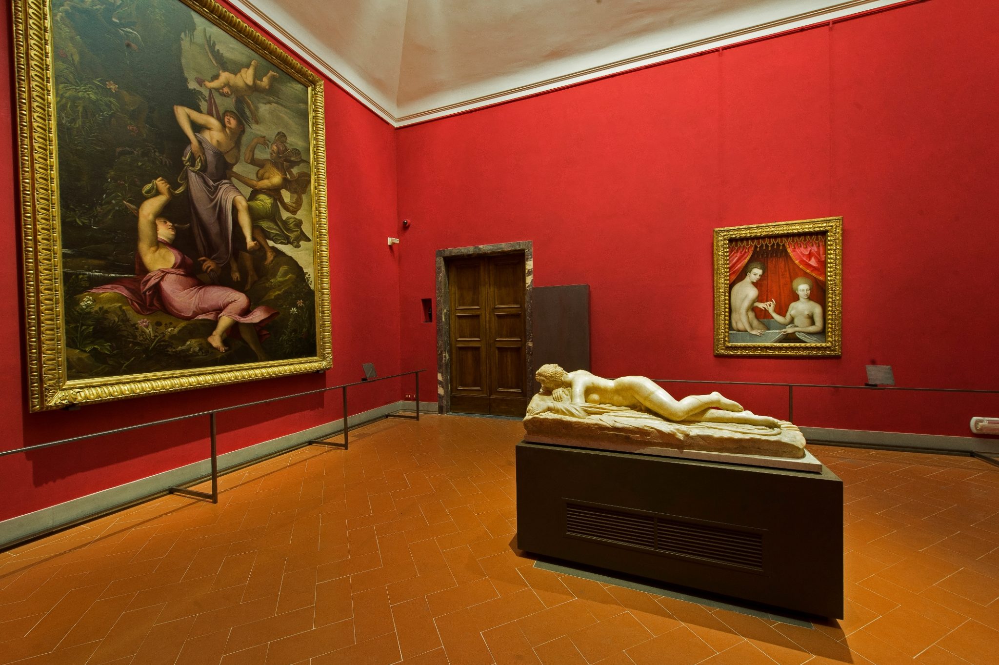 Le pareti sono state tinteggiate dello stesso rosso cremisi che connota la Sala di Michelangelo e gli ambienti dedicati alla pittura del Cinquecento, al primo piano di ponente della Galleria.