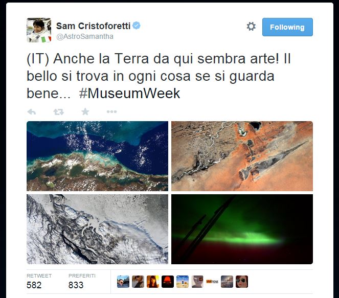 @MuseumWeek” dallo spazio è arrivato il cinguettio di Samantha Cristoforetti: “Anche la Terra da qui sembra arte! Il bello si trova in ogni cosa se si guarda bene… #MuseumWeek”