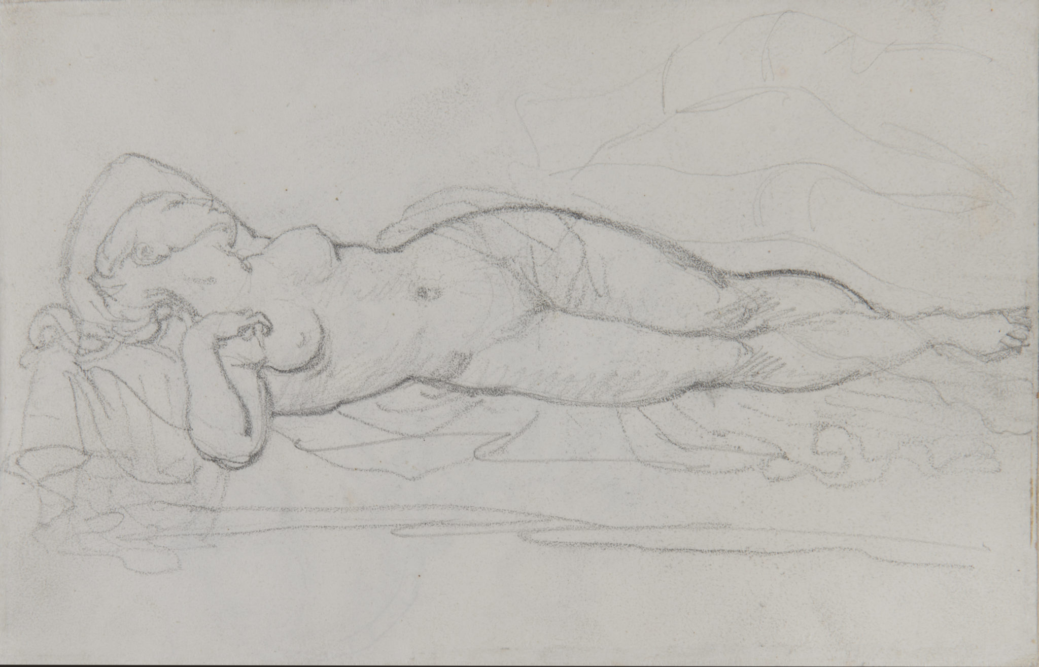All’ideale di perfezione estetica inseguito dalla pittura neoclassica si contrappone un foglio disegnato, sia sul fronte che sul retro, da Théodore Géricault, impetuoso protagonista del movimento romantico capace di rivoluzionare i rigidi standards accademici del grand genre. Anticonformista nell’arte come nella vita, Géricault esplorò con ardente curiosità anche il tema della sessualità. Il dritto del foglio esposto da Antonacci Lapiccirella appartiene appunto al filone erotico della sua produzione, un filone non ancora pienamente riscoperto e studiato a causa del clima di pruderie che, per molti decenni, indusse i proprietari delle opere a tenerle occultate. La donna nuda languidamente distesa su un letto è il primo studio conosciuto del cosiddetto Trio érotique, dipinto scoperto solo nel 1992 ed attualmente esposto al Getty Museum di Los Angeles.
