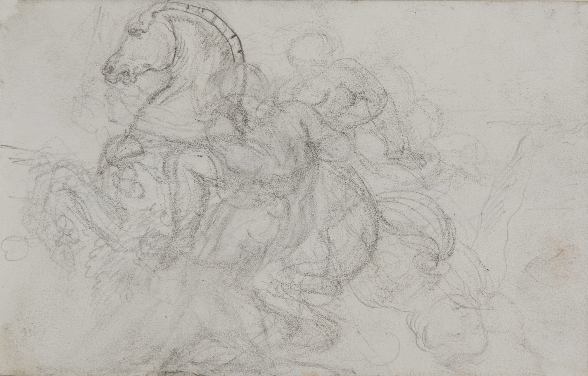 Sul retro si vede invece una dinamica scena di combattimento: Ercole, un soggetto molto amato da Géricault, si scontra con Ippolita, Regina delle Amazzoni. Il disegno, realizzato su entrambe i lati tra il 1816 e il 1817, il periodo del soggiorno romano dell’artista, sarà pubblicato sul Catalogue raisonné des dessins inédits et retrouvés de Théodore Géricault, in preparazione a cura di M.Bruno Chenique.