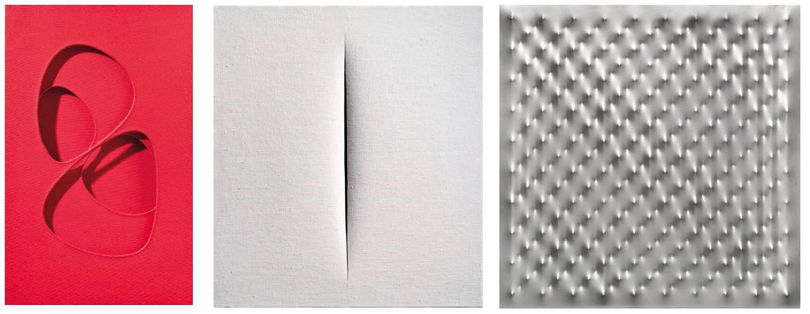 Fontana influenzò molti suoi contemporanei, come Castellani, Bonalumi, Scheggi e Simeti, tutti simultaneamente in rottura con l’approccio tradizionale alla pittura. La Superficie argento di Castellani è un elegante esempio della serie delle Superfici, realizzato in una rara tonalità argento (stima: €150,000–€200,000). Ispirandosi alle tele tagliate, Scheggi mirava a mettere alla prova le dinamiche della percezione con lavori visivamente complessi, come si può vedere in Intersuperficie curva dal rosso, eseguito nel 1963, agli inizi della purtroppo breve carriera dell’artista (stima: €300,000-€500,000).