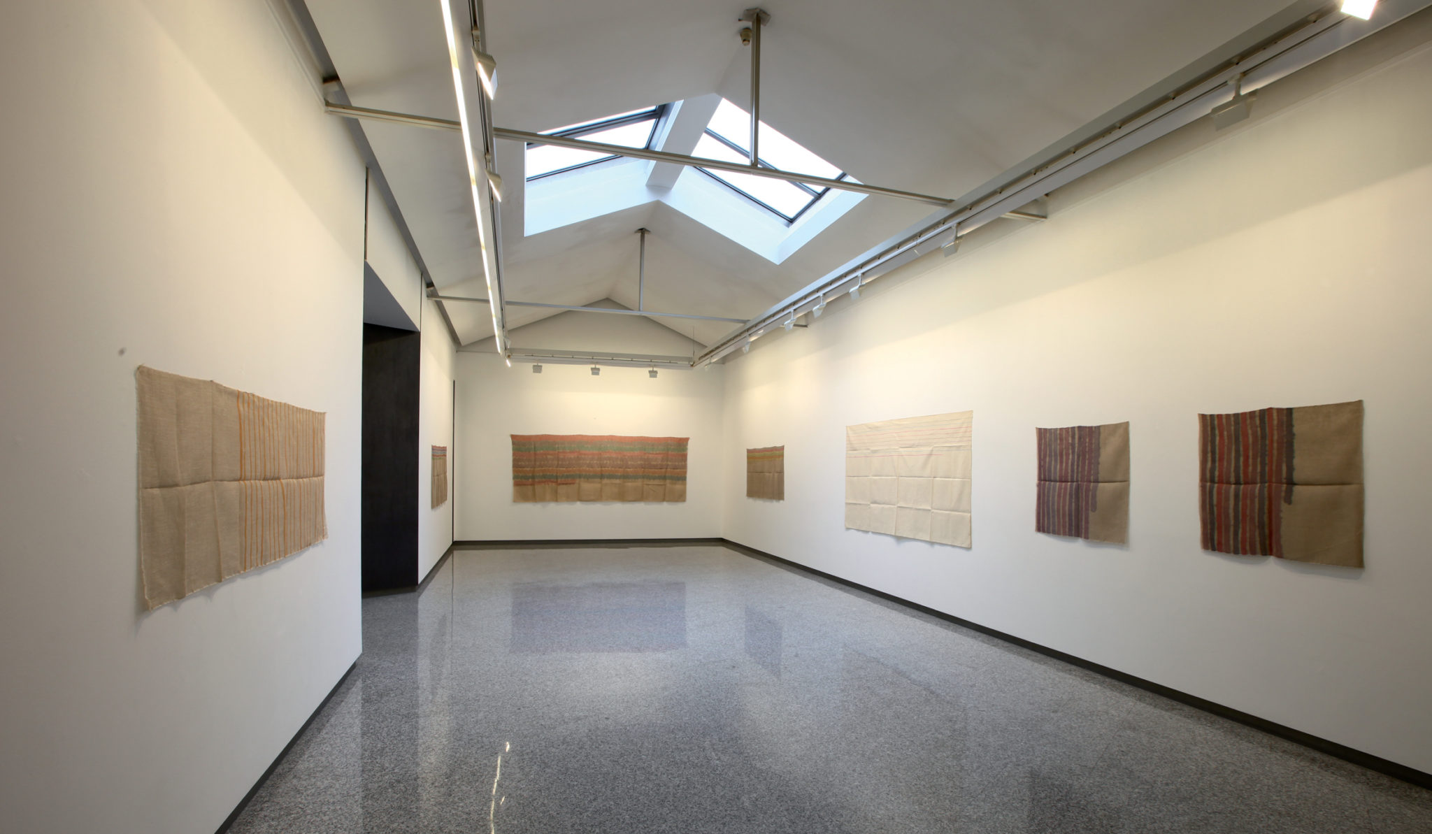Le tele, prive di supporto, vengono appese direttamente alle pareti. Questo volontario allontanamento dagli elementi classici evoca un’idea di movimento, un attraversamento della pittura verso lo spazio intorno ad essa. Un fare artistico minimale e concettuale sospinto verso una dimensione tra il finito e l’infinito.