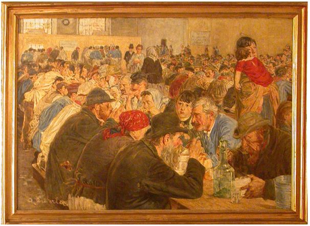 Verso la fine dell’Ottocento, Milano si apre all’industria e accoglie masse di operai, attirati dalla prospettiva di una vita migliore. Quello che trovano spesso invece è miseria e povertà. Il soggetto del pranzo in una mensa per i poveri affascina Pusterla. Lo stesso tema è raffigurato, ad esempio, nel dipinto custodito alla GAM di Milano dal titolo “Alle cucine economiche di Porta Nuova”, del 1887.