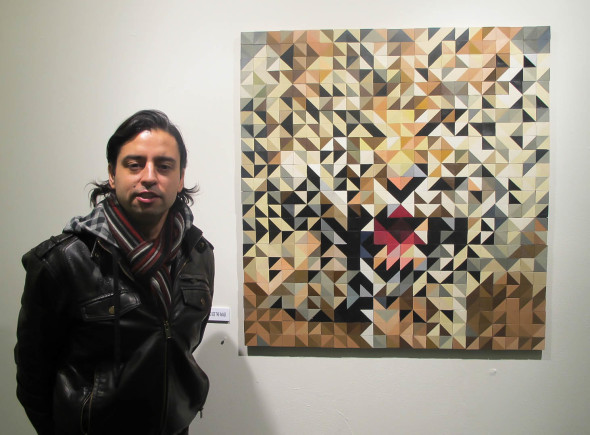 The title wall sports the show’s name and curator as well as the artist’s name – below which is an emblazoned black triangle as if to signal a cynical view of social disparity in the works’ thematic departure. Maslow’s Hierarchy of Needs perhaps? Or that especially pernicious business model, the “pyramid scheme” – a term no one can invoke without an obligatory eye roll. But the work on display betrays no such notions. Rather, the triangle is the means by which Martinez renders two-dimensional form. Some paintings are comprised of wooden squares fastened together grid-like and sectioned off into right triangles resulting in something of a pixilated image. Others are assembled from fabric and a few seem to be computer generated.