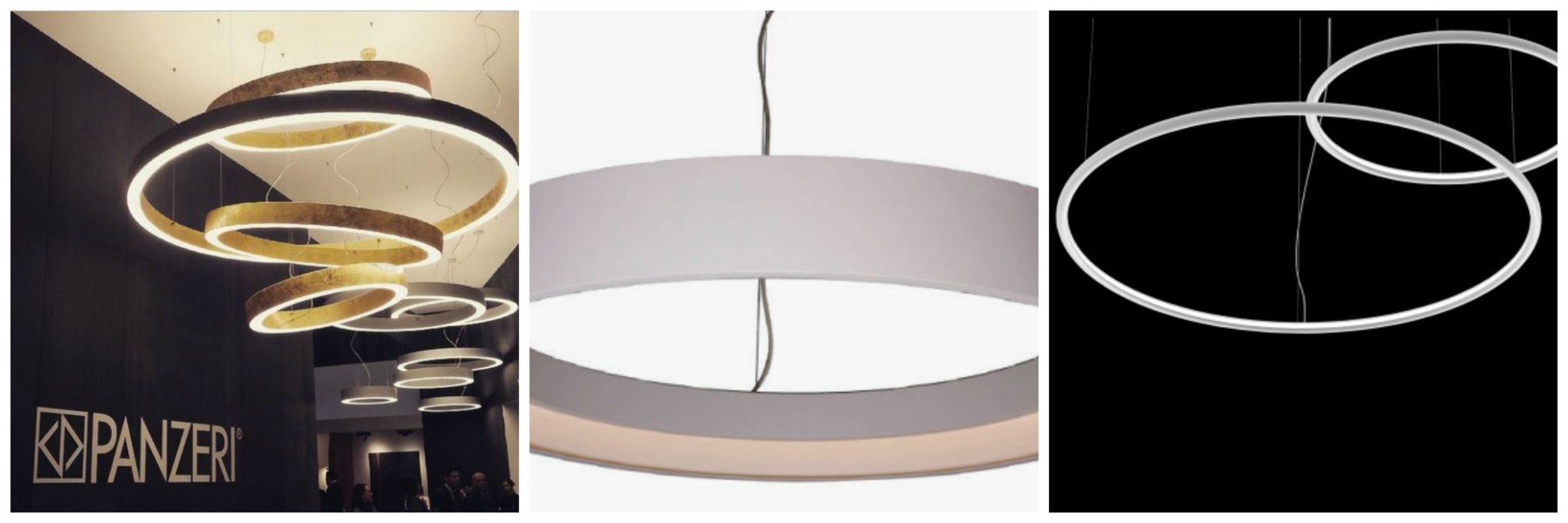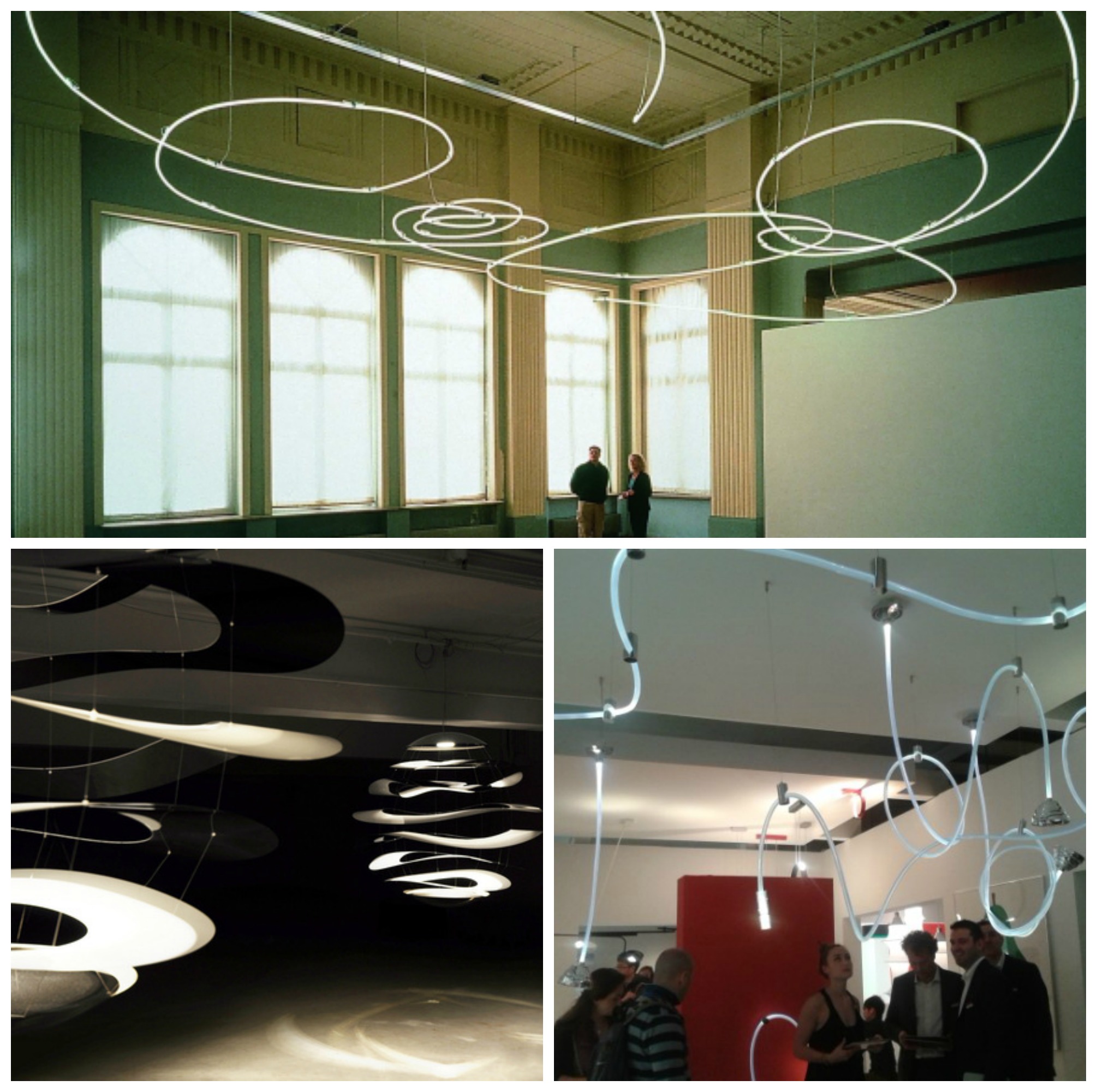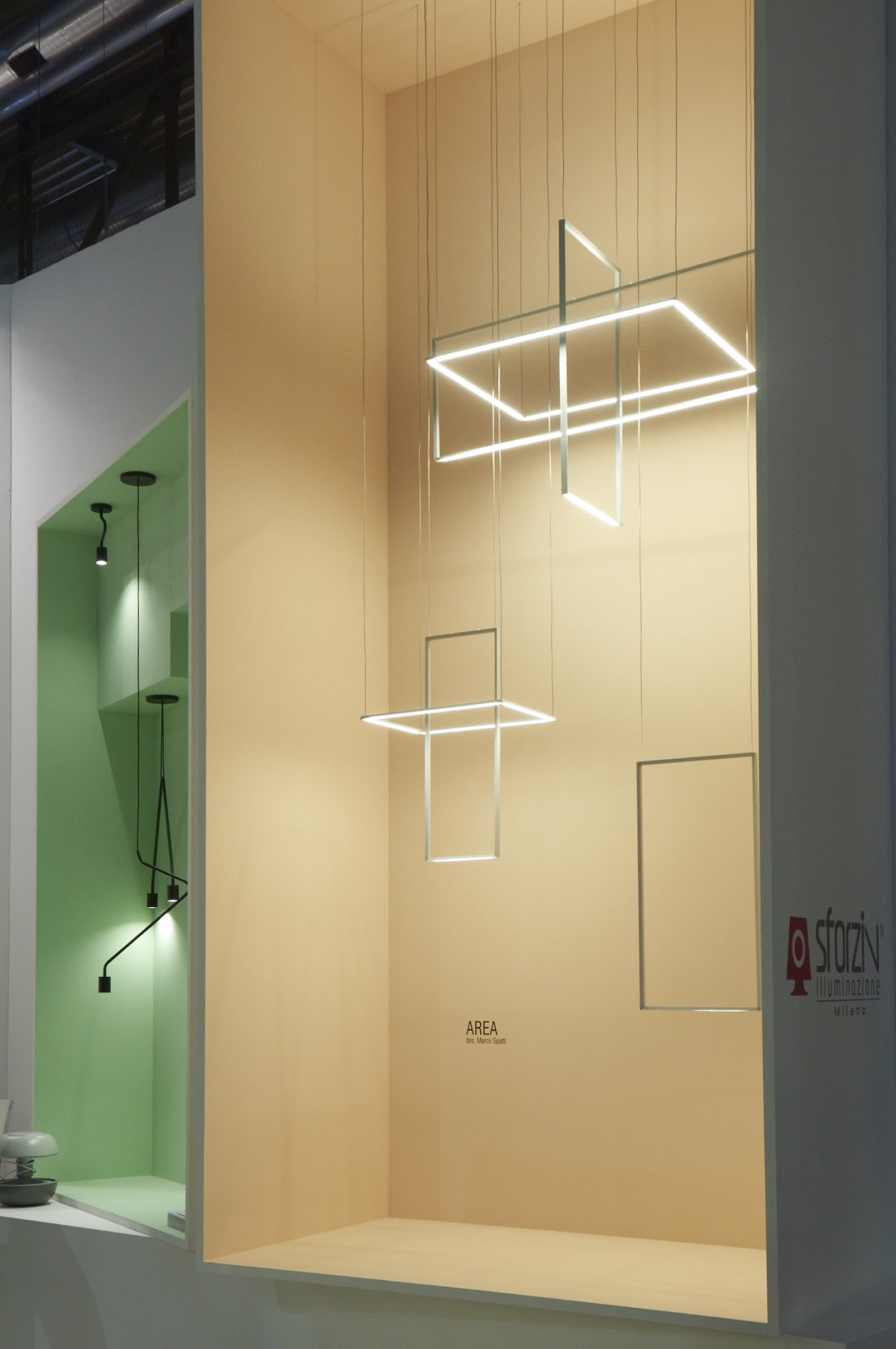 In quello che sembra essere il paradiso della lampada – riproposto al Salone proprio nell’anno che l’Unesco dedica alla luce – gli occhi si voltano al cielo alla scoperta di dinamiche contorsioni luminose che strizzano l’occhio alle sculture di Lucio Fontana. Numerosi gli esempi: dalla “Golden Ring” di Panzeri, ai tubi luminosi di Danese Milano; da “Buckle” di Tina Leung per Innermost Ltd, alle “Hoola” e “Hoop” di TossB.