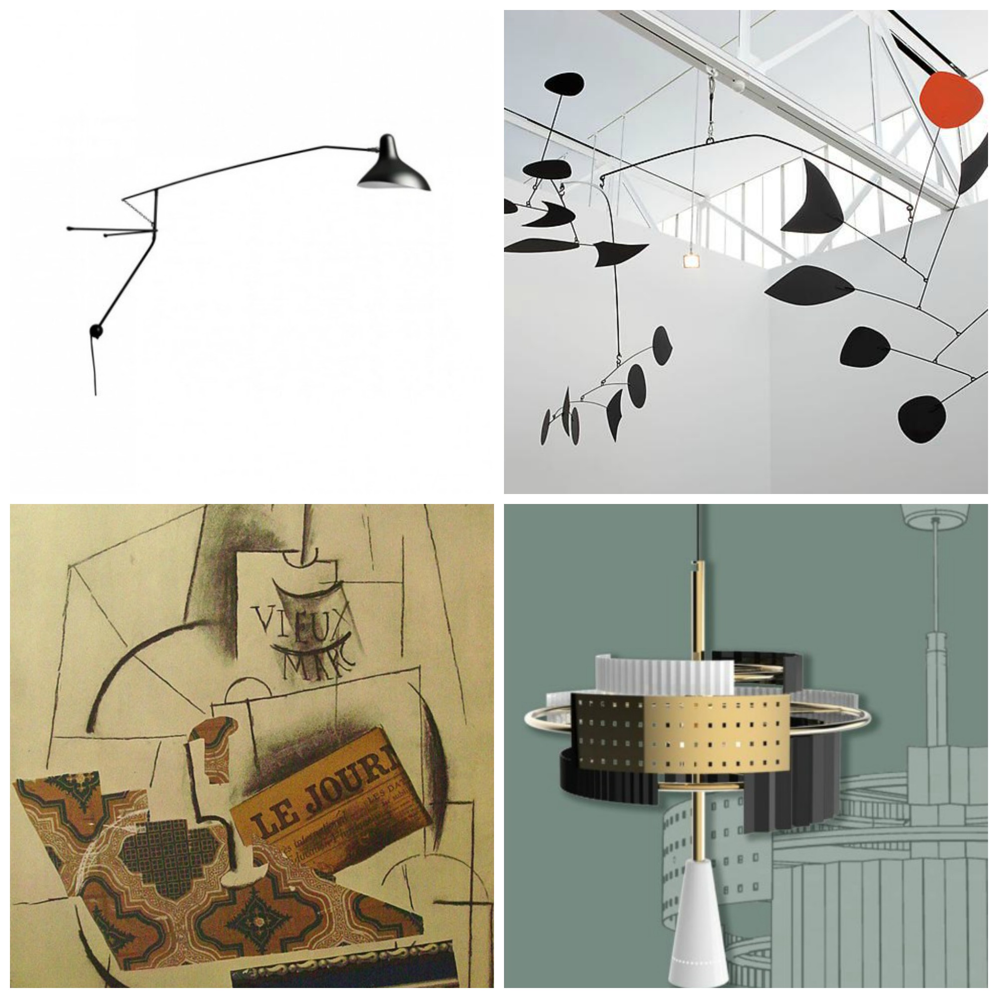I sottili steli dalle linee spezzate e i leggeri paralumi delle lampade Mantis fanno pensare ai mobile di Alexander Calder, mentre il lampadario “Wallie” di Tato che accosta forme e materiali diverse si ispira ai papier collé di Picasso – come ha dichiarato la stessa designer Lorenza Bozzoli.