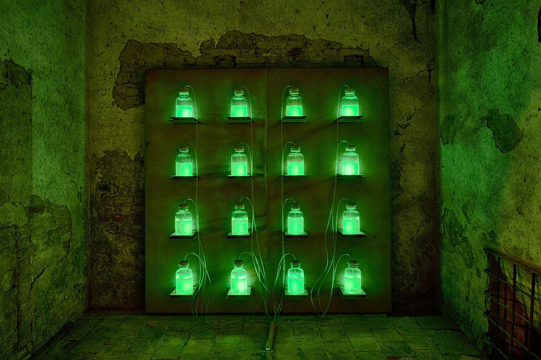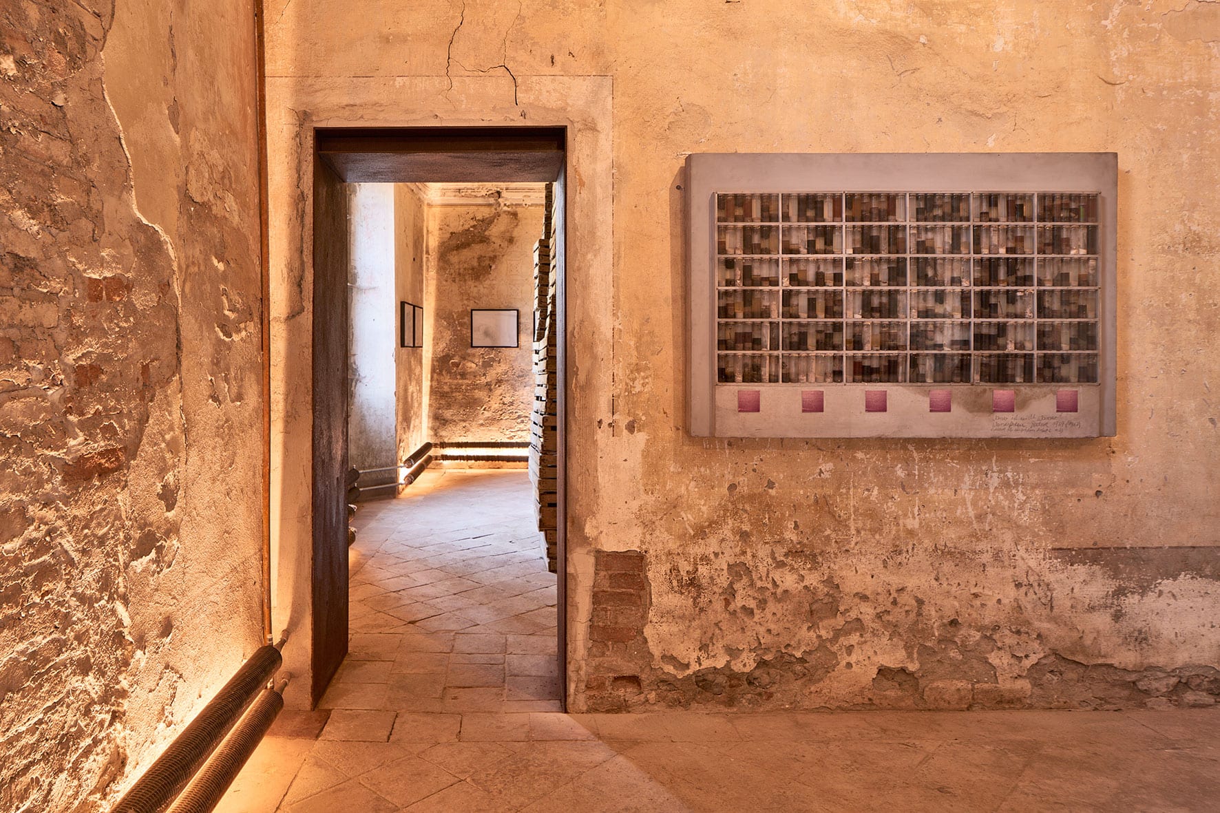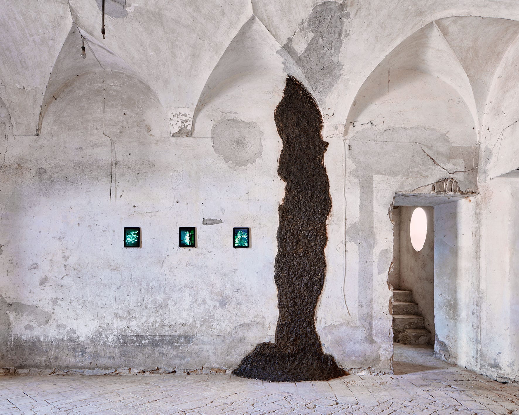 Centrali, anche per l’allestimento, sono i temi del riuso e della stratificazione: accanto allo sterco, costantemente riutilizzato ed inserito in un processo di vita ciclico che conferisce poeticità alla materia, oggetti di scarto e riciclati come le originali porte del castello, gli strumenti di lavoro delle campagne, iPad e iMac di vecchia generazione, diventano supporti espositivi, trasformati nel significato o nella loro funzione originaria. Gli espositori in ferro, parzialmente rivestiti in sterco, si pongono in continuità con tutti gli interventi strutturali e diventano parte integrante dell’ambiente, una stratificazione materica e volumetrica che deriva e si nutre del suo contesto.