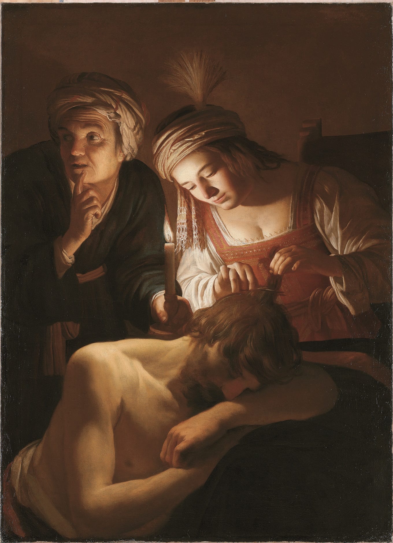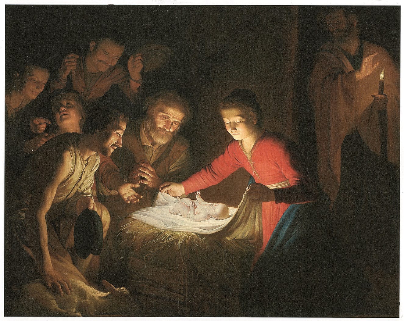 Tra le prime opere di impronta nordica dell’artista troviamo ‘La preghiera di Giuditta prima di decapitare Oloferne’ (collezione privata), mentre tra quelle del periodo più maturo la ‘Buona ventura’ (Uffizi 1616-17). La luce investe all’improvviso i personaggi facendoli uscire dal buio e blocca l’azione come in un fotogramma (‘Sansone e Dalila’ o ‘Gesù nella bottega di Giuseppe’). Il contrasto tra luce e ombra si fa estremo nell’’Adorazione del Bambino’ dove la luce sacra emanata da Gesù (‘luce che brilla nelle tenebre’) si riflette sul panno bianco che l’avvolge illuminando tutta la scena. Ma se nella precedente tela Gesù conserva le sue sembianze naturali, emanando luce sacra che illumina lo spazio intorno a lui, nell’’Adorazione dei pastori’ (Germania collezione privata) è pura luce, Gesù è fosforescente, bianco come il panno che illumina.