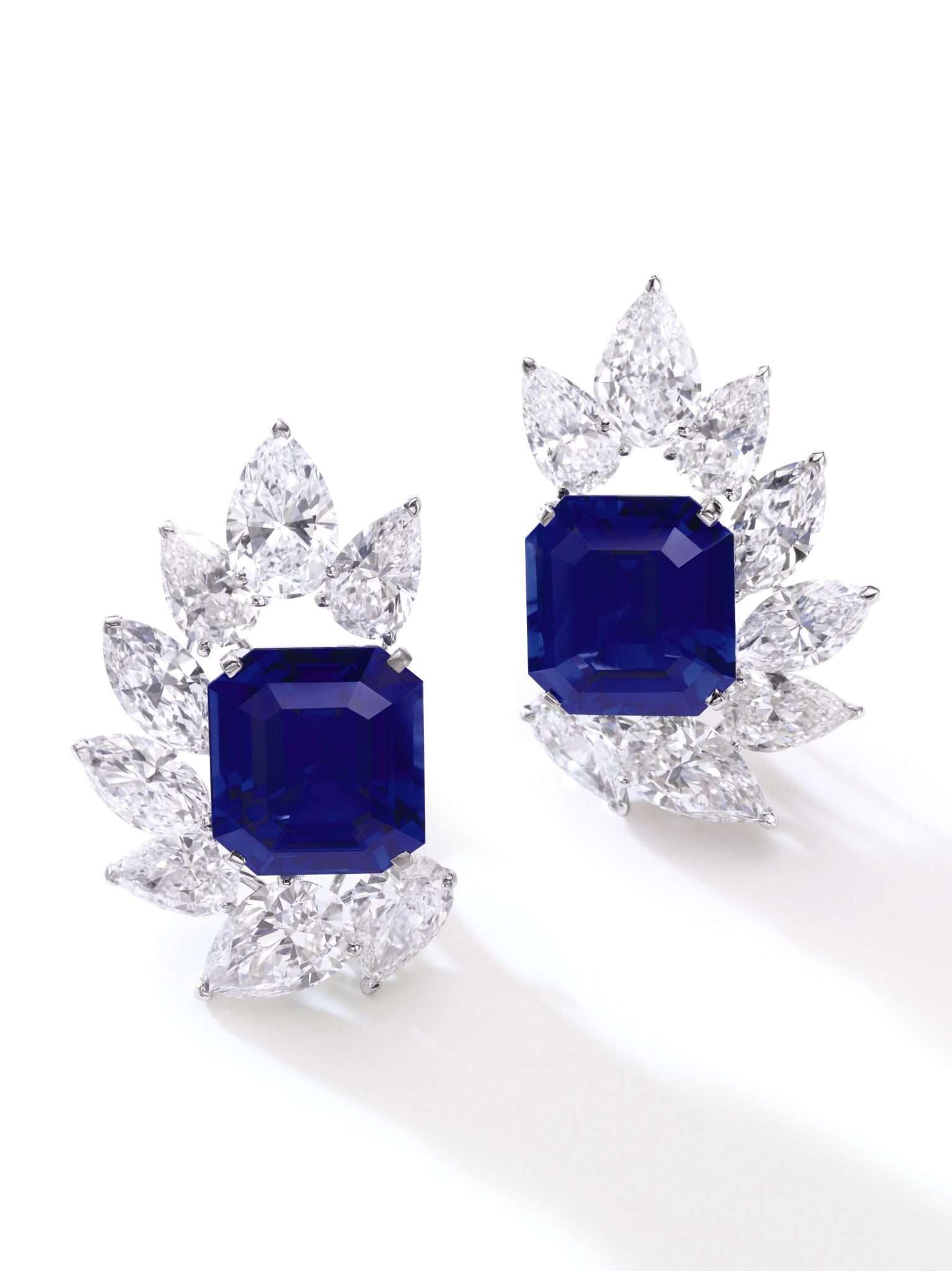 Sempre dalla stessa collezione, con la firma di Cartier: la splendida Spilla sormontata da un magnifico zaffiro del Kashmir, di 30.23 carati,dal colore di rara intensità, (LOT 499, val. CHF 3,410,000-5,850,000/ US$ 3,500,000-6,000,000) e la coppia di Orecchini in diamanti, con due bellissimi zaffiri Birmani di Mogok centrali, eccezionali per simmetria e qualità (LOT 500, val.CHF 780,000-1,170,000/US$ 800,000-1,200,000).