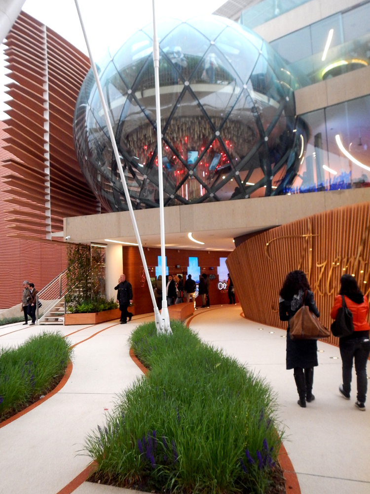 Un mosaico espositivo composto da Cluster e Padiglioni all’insegna del tema, stranoto, di “Nutrire il Pianeta, Energia per la Vita”. L’alimentazione, quale tema vitale e quotidiano per l’intera popolazione mondiale, con tutte le sue peculiarità e problematiche, al centro dell’Esposizione. Ogni Paese, partendo dalla propria cultura e dalle proprie tradizioni, è chiamato a interrogarsi e a proporre soluzioni rispetto alle grandi sfide legate alle prospettive dell’alimentazione. 145 i paesi partecipanti più gli spazi di organizzazioni internazionali e no profit, aziende: Ferrero, Perugina, Lindt,… anche se il “privato” per eccellenza su cui tutto gravita è Eataly e i suoi ristoranti divisi per regione, genuini quanto radical a chilometro zero, spadroneggianti al centro del “mondo” – con annessa e connessa mostra di Sgarbi che si teme dalla strabordante retorica, manchevole di logica, aperta dal 15 maggio. Titolo: “I Tesori d’Italia”, concetto base: “far emergere la biodiversità dell’arte”. Detto tutto.