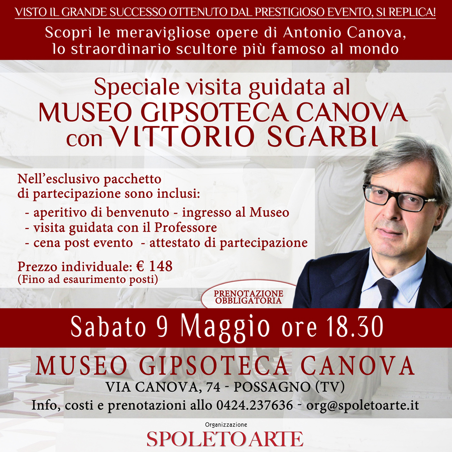 Torna Sgarbi al Museo Canova di Possagno, sabato 9 maggio 2015, ore 18.30: una Serata speciale, con aperitivo di benvenuto, visita al Museo, guida del Professor Sgarbi, cena post-evento.