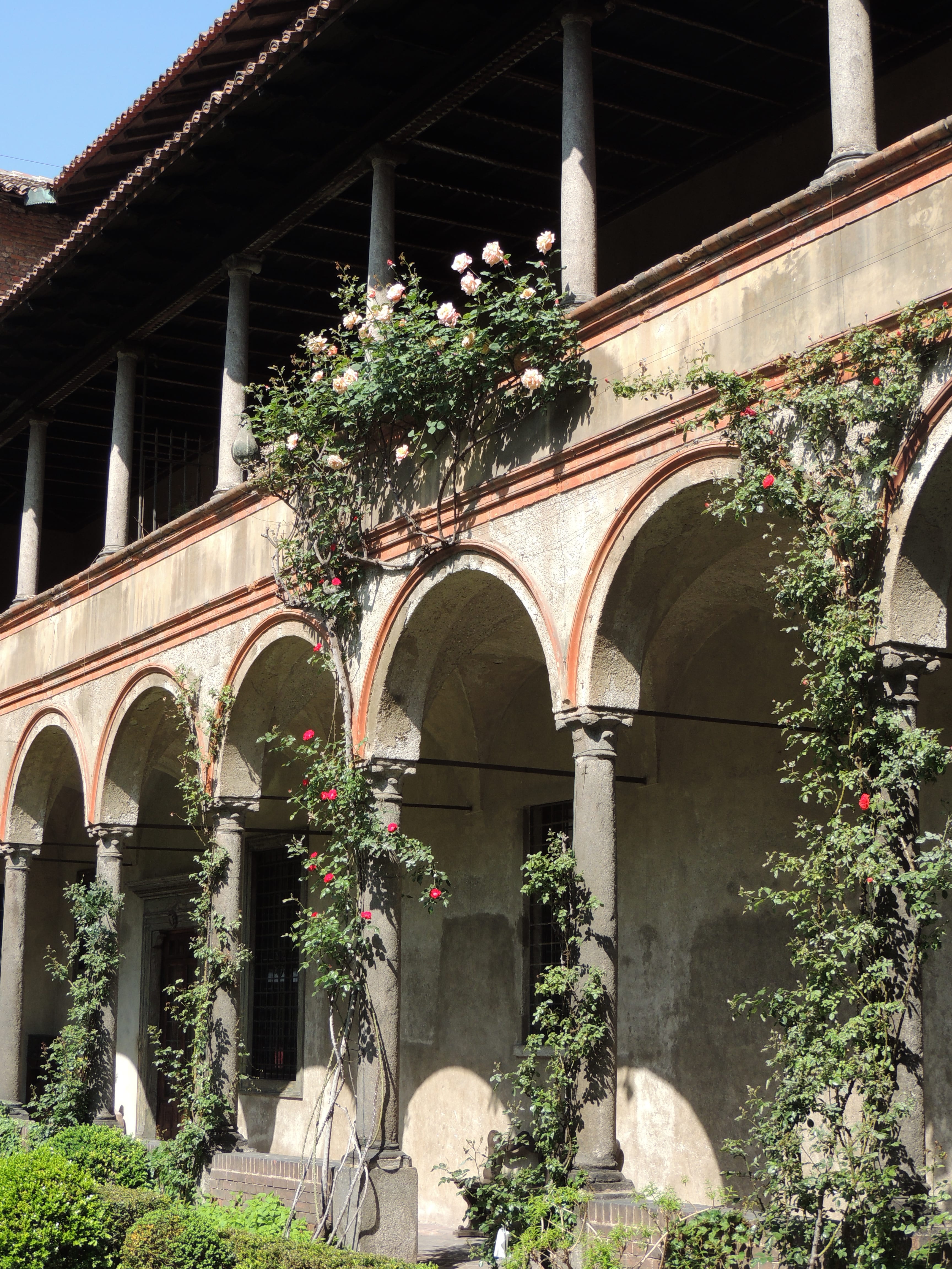 Spolveriamo un po’ la storia del Chiostro. Via Cappuccio a Milano – dove si trova questo scrigno prezioso – è una delle poche vie della città che segue ancora il suo tracciato medievale originario. Il Chiostro oggi è l’ultima testimonianza rimasta dell’ex monastero di Santa Maria Maddalena al Cerchio, dove dai primi anni del 1000 vivevano le Monache appartenenti all’ordine degli Umiliati, dalle quali la via prende il nome. Le monache, numerosissime fin dal XVI secolo, erano chiamate “Signore Mosche” poiché spostandosi per la via facevano pensare a uno sciame di mosche in movimento. Vi abitarono fino al 1801 quando, probabilmente per ordine di Napoleone, il monastero fu soppresso. Fu questo il vero momento buio del complesso: venduto e adibito a magazzino, fu diviso in piccoli appartamenti e in gran parte demolito. Della Chiesa, ad esempio, non resta alcuna traccia. Il Chiostro invece, edificato negli anni Ottanta del Quattrocento, ebbe una sorte migliore, riuscendo a resistere al tempo e ai cambiamenti della società.