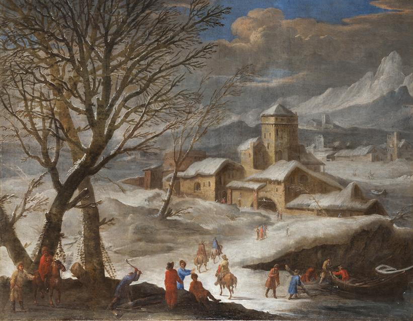 Il primo artista a vedere la luce, tra quelli rappresentati, è Sinibaldo Scorza, figura emblematica per le liaisons liguri-piemontesi che la mostra intende sottolineare, perché nasce nel 1589 a Voltaggio, oggi in provincia di Alessandria ma allora parte del territorio della Repubblica di Genova, e poi attivo come miniatore e pittore sia in Liguria che in Piemonte. Vedete qui uno splendido Albero con grande pavone e altri uccelli che palesa le sua abilità di “animalista”, e un incantevole Paese nella campagna innevata, emblematico della sua serie di paesaggi ritratti nella magica sospensione che la sua pittura ci regala, tra il fiabesco e il reale.