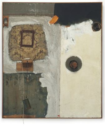 oil, metal, fabric, wood, paper, twine, picture frame, shaving brush and tin can on masonite in artist’s frame