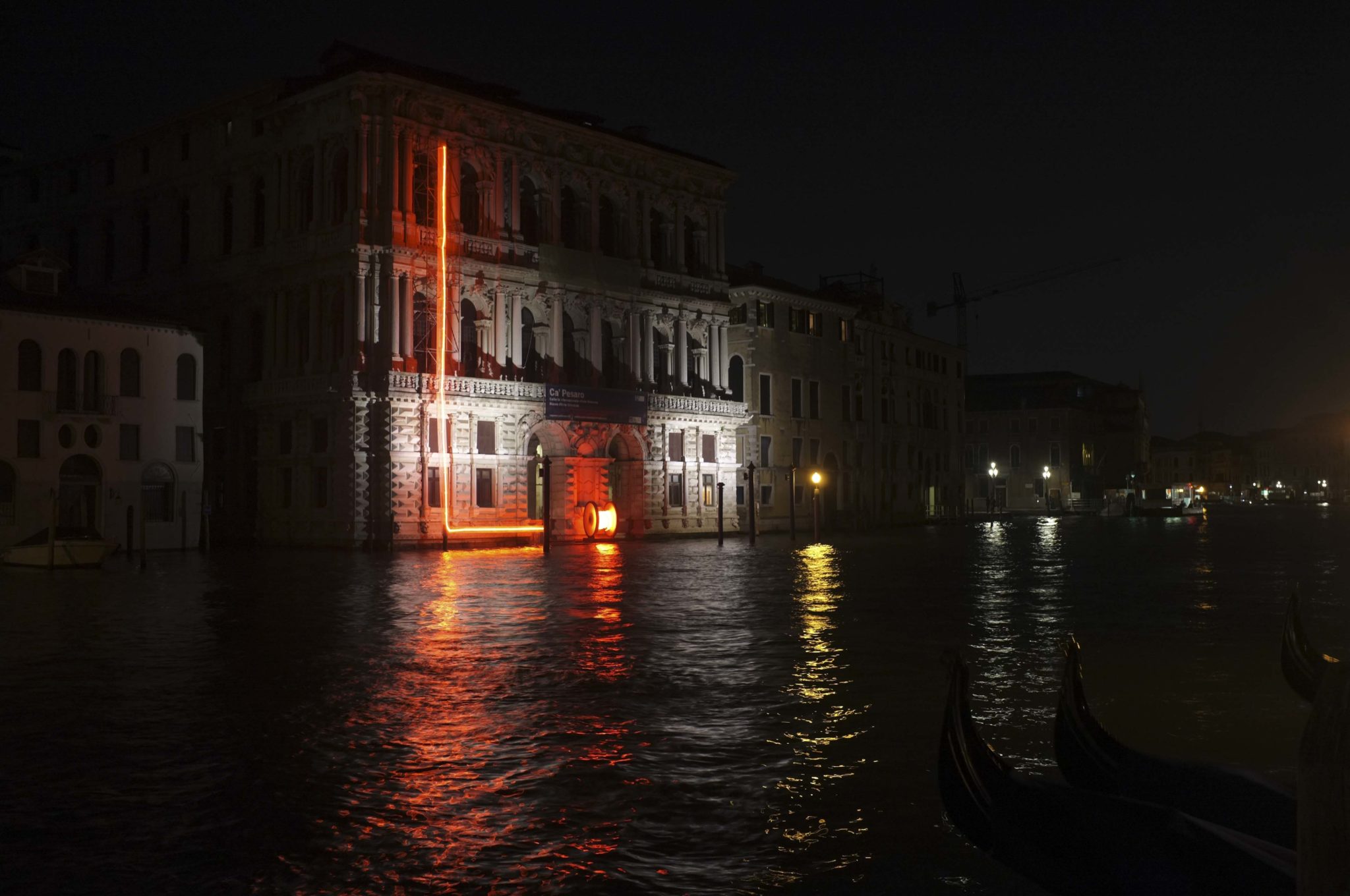 L’opera è composta da una struttura in ferro attraversata da un cracked neon rosso “always in motion” che raggiunge alla base una “Venere” tecnologica adagiata sulle rive del Canal Grande, quest’ultima composta da una monumentale bobina in lastra di vetro.