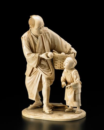 L’arte giapponese è rappresentata egregiamente da un okimono in avorio raffigurante un venditore di frutta, di squisita realizzazione.