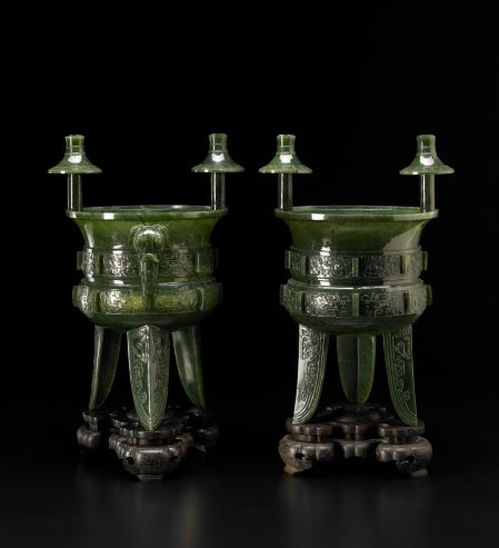 Per l’ambito Cina tra le numerose giade, spiccano due splendidi vasi color verde spinacio, risalenti al periodo dell’imperatore Qianlong (1736-1795) con raffinate decorazioni in stile arcaico.