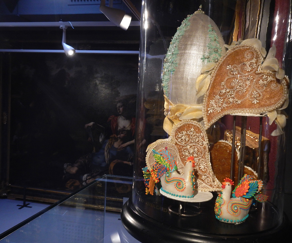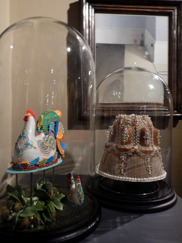 Va beh, vedrai che sarà molto meglio dentro, lascia perdere questo, sei solo all’inizio mi ripetevo. “Tu chiamale se vuoi illusioni”, speranze mal riposte. Vai con gli improbabili accostamenti nonsense. Frutta piemontese di Francesco Garnier Valletti coronata da pizzi alimentari sardi, perché dovete sapere che qua e là per la mostra, sopra qualche teca o a fianco a qualche opera, compaiono panettoni di pizzo e biscottini impizzettati. No, davvero, ci sono pure dei galletti ricamati.