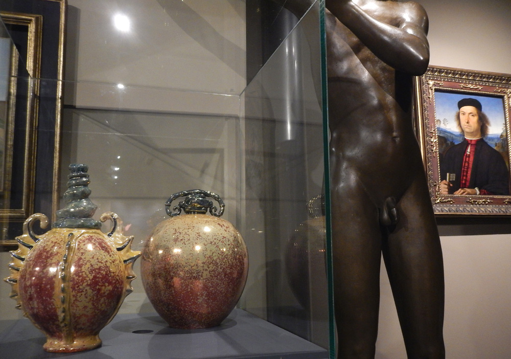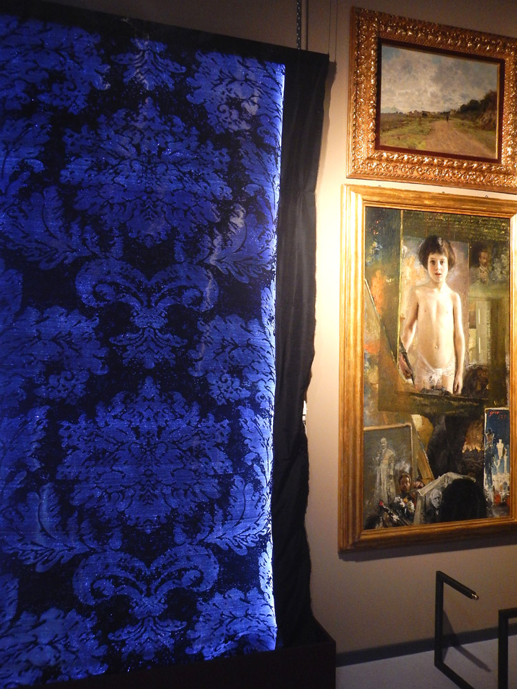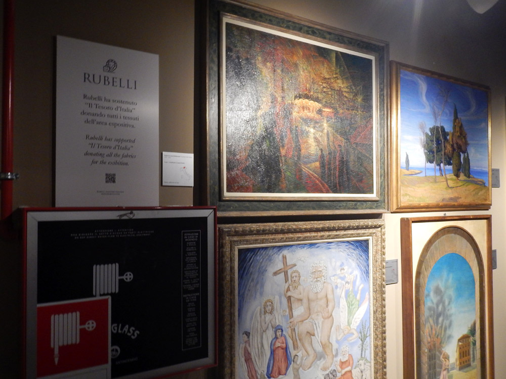 Ecco dei duetti fantastici: un “arazzo” della Rubelli Design Studio (sponsor della mostra) a fianco de “La verità” di Mancini; un “Leopardo” di Ligabue con una specie di stele senza nome e senza un perché (però prova a nascondere un condizionatore); un “San Bartolomeo” di Nicola di Maestro Antonio (Marche) con una Maria incoronata su tavolino di velluto (non c’è nome e regione ovviamente); e via con altre coppiette improbabili a destra e sinistra.
