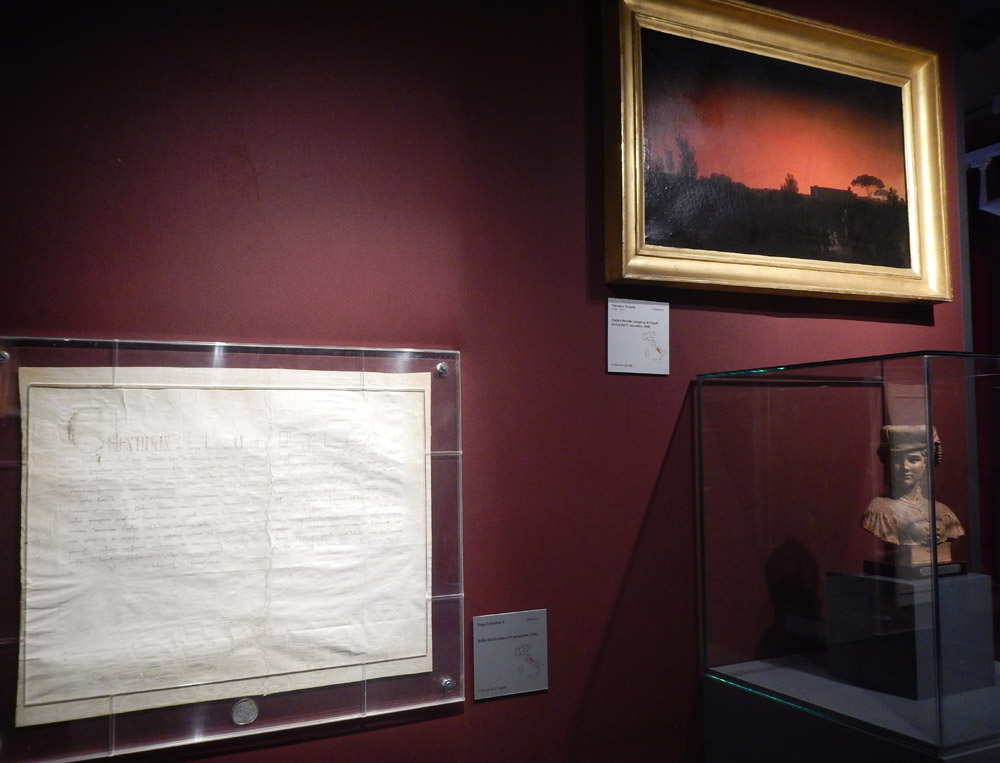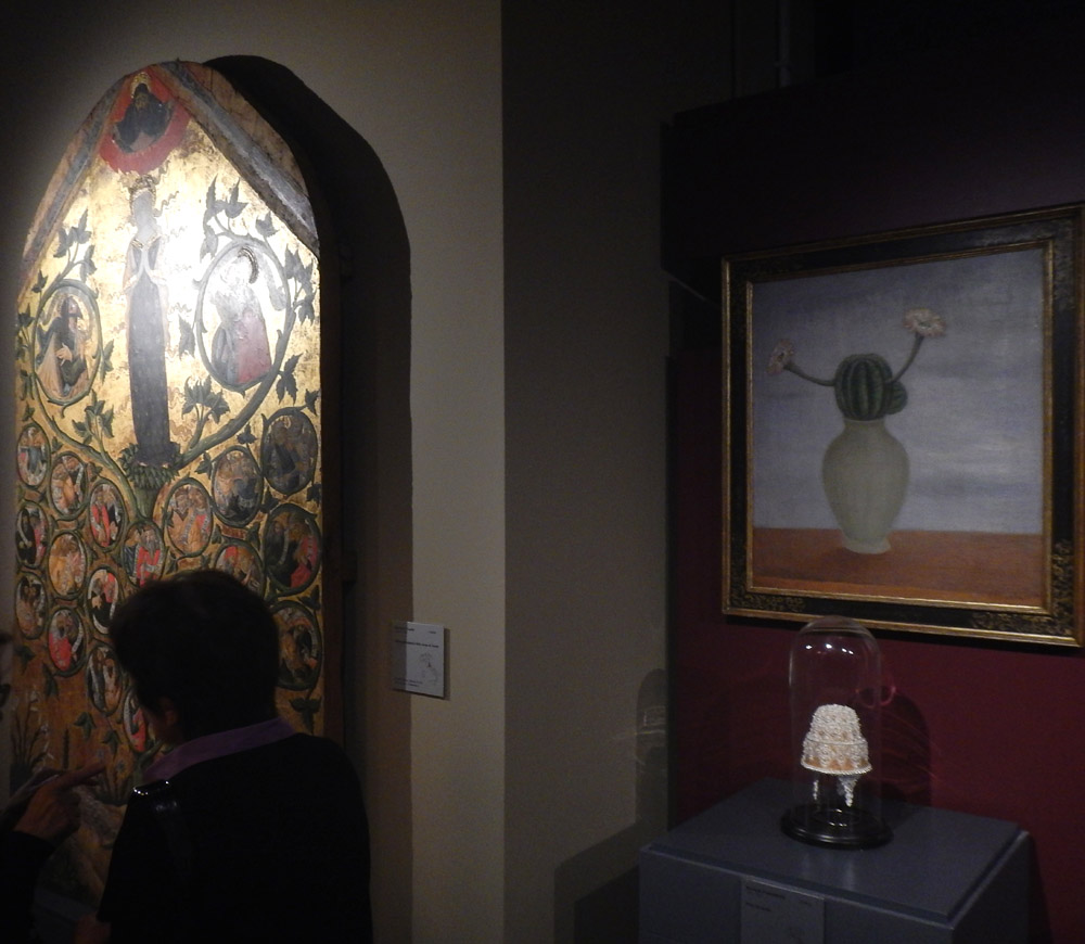 Poi compaiono alcuni trittici incredibili: numero 1 – la “Bolla del Perdono del 1294” di Papa Celestino V (Abruzzo), “La Scannese” di Costantino Barbella (sempre in quota Abruzzo) e la magica “Aurora boreale comparsa in Napoli la sera del 17 novembre 1848” di Salvatora Fergola (Campania); numero 2 – l’Albero genealogico della stirpe di David di Matteo da Gualdo (Umbria) col “Fiore di cactus” di Riccardo Francalancia (Umbria), sempre con immancabile panettoncino di pizzo sardo in primo piano.