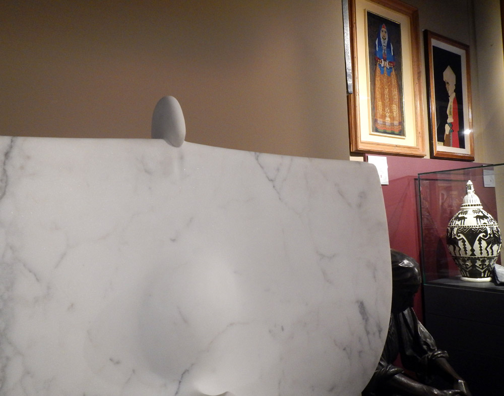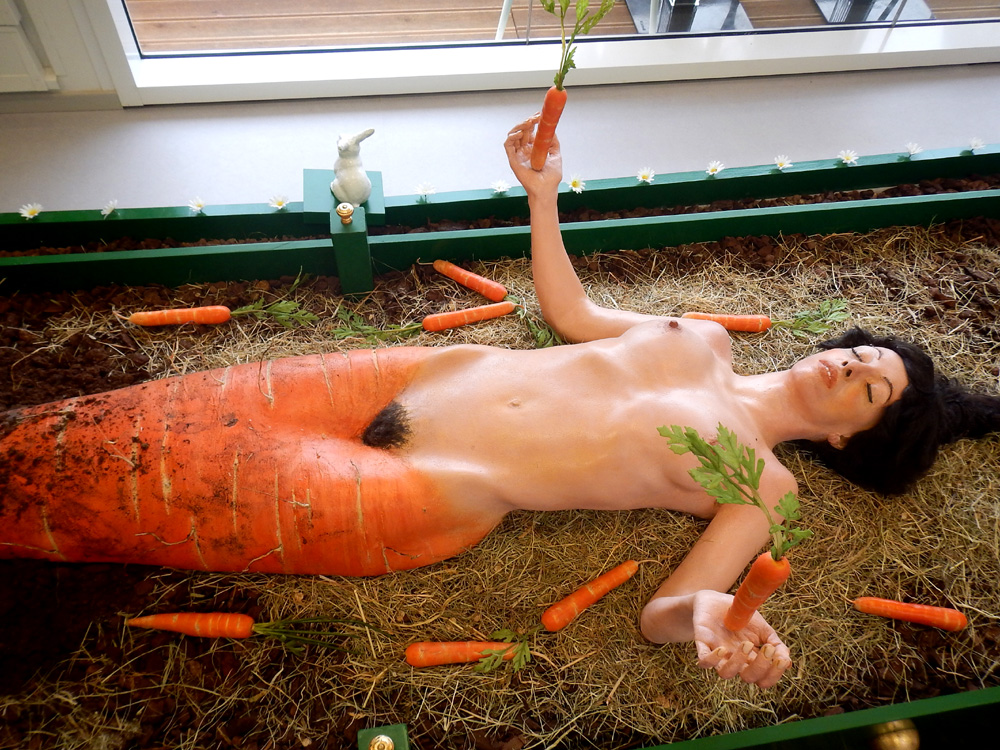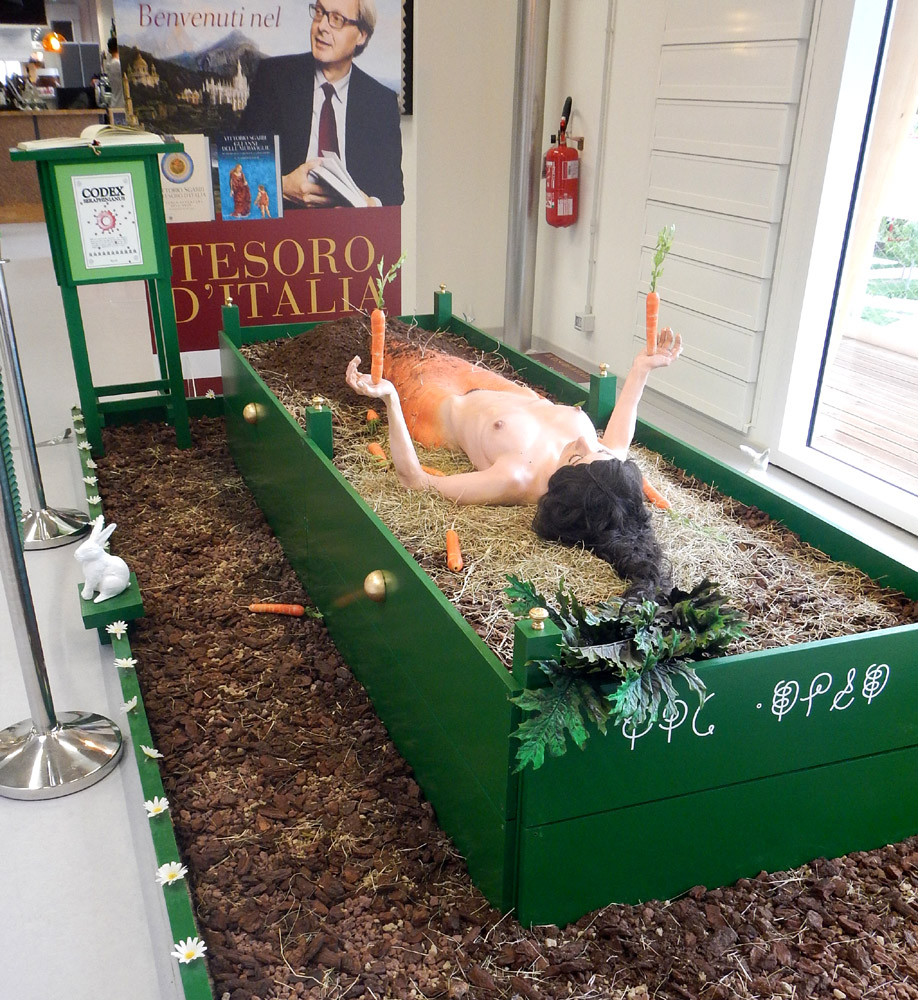 Di certo NON aiuta l’imbarazzante donna-carota di Serafini (che regione e che vento sarà stato a plasmarla? boh!) che accoglie il visitatore, con tanto di margheritine posticce e candidi coniglietti che le fanno da guardia, preceduta dall’ammiccante faccione di Sgarbi con appresso il nuovo libro. Amen, lasciamo stare. Proseguiamo.