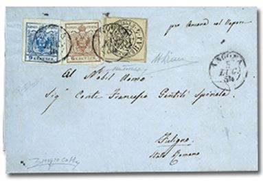 mista nota di Pontificio con la I emissione di Austria e una delle massime rarità delle affrancature miste dei ducati italiani con Stati europei – Cert. Colla – Firme A.Diena, Renato Mondolfo e A.G.Bolaffi