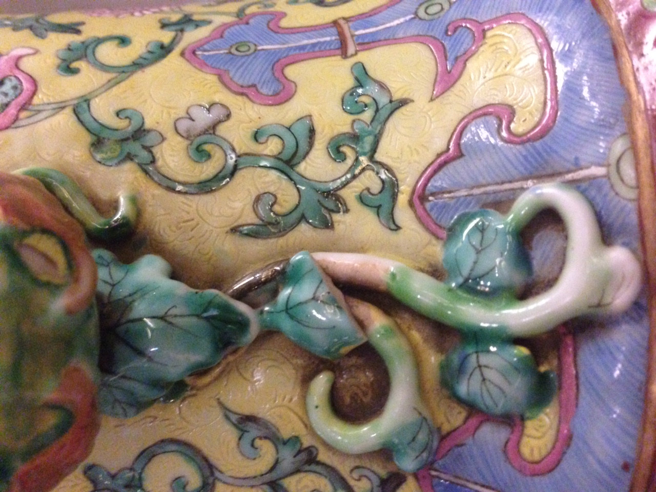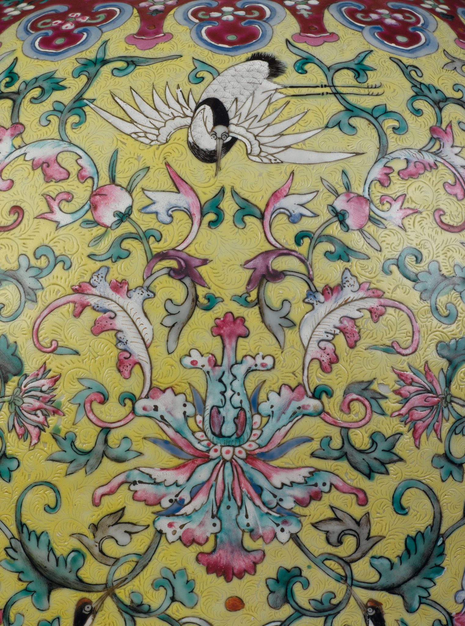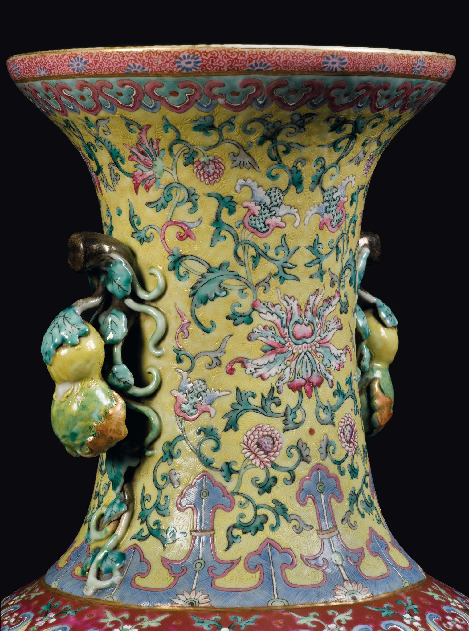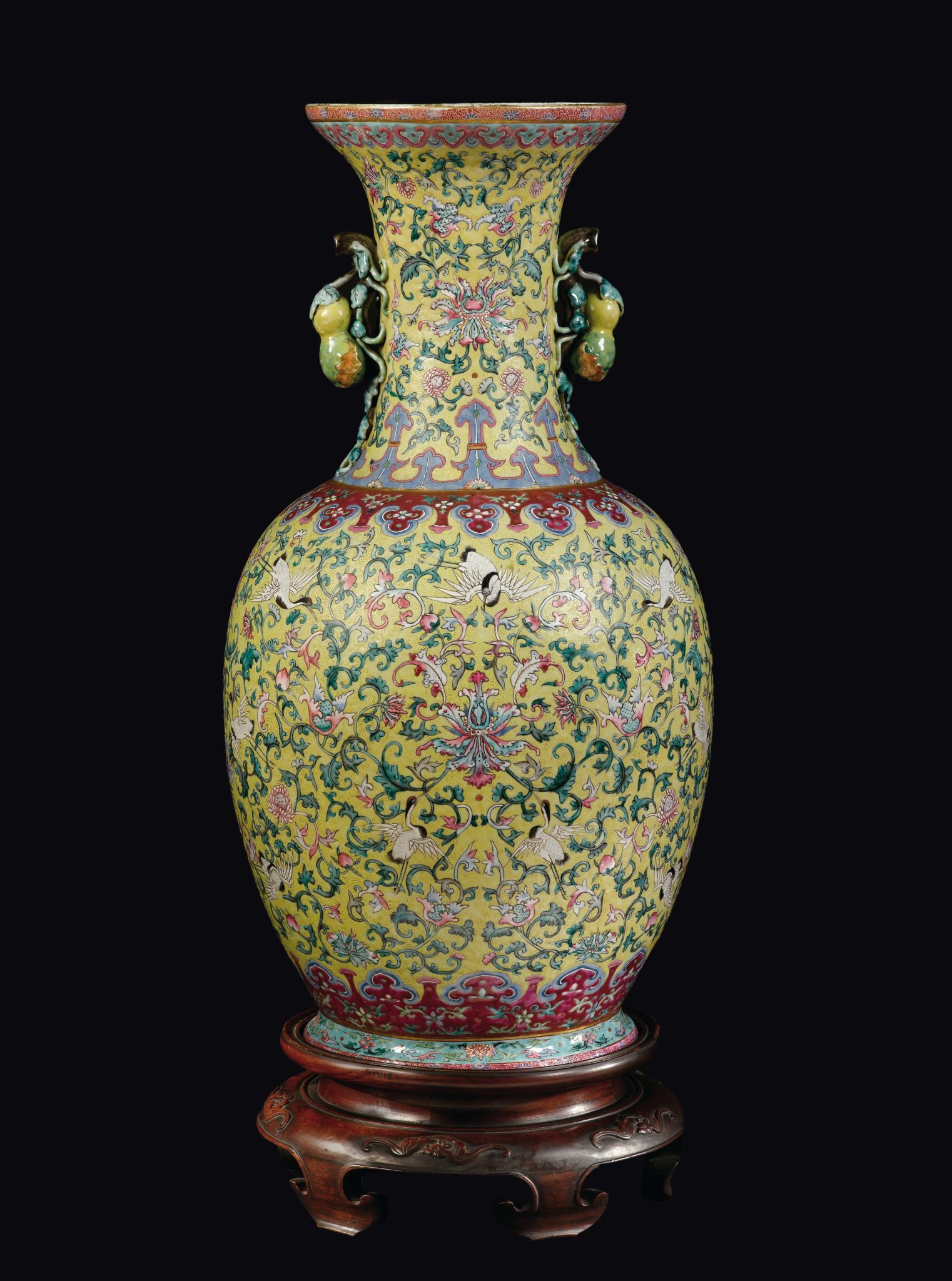 Un grande vaso in porcellana a smalti policromi a fondo giallo con decoro di cicogne e anse a doppia zucca e pipistrelli sulla bocca (Cina, Dinastia Qing, marca e del periodo Daoguang (1821-1850), h cm 68) stimato € 40.000 – 60.000, è stato venduto per 124.000 €.