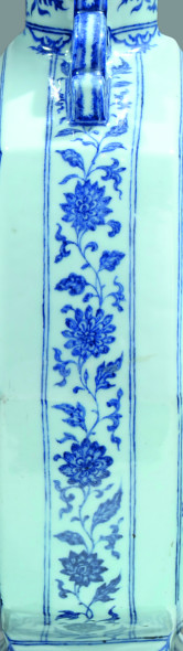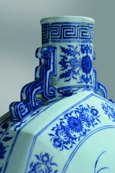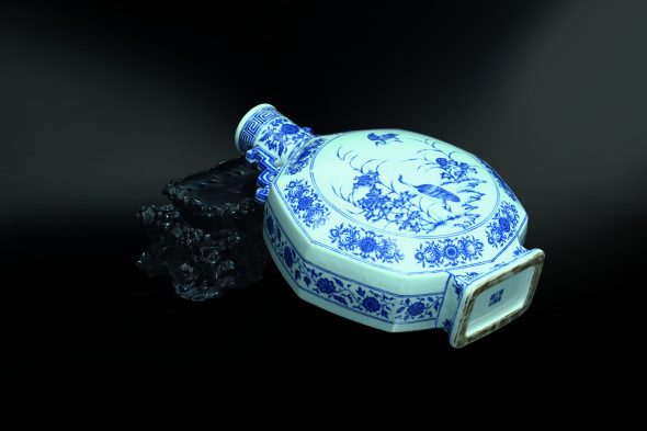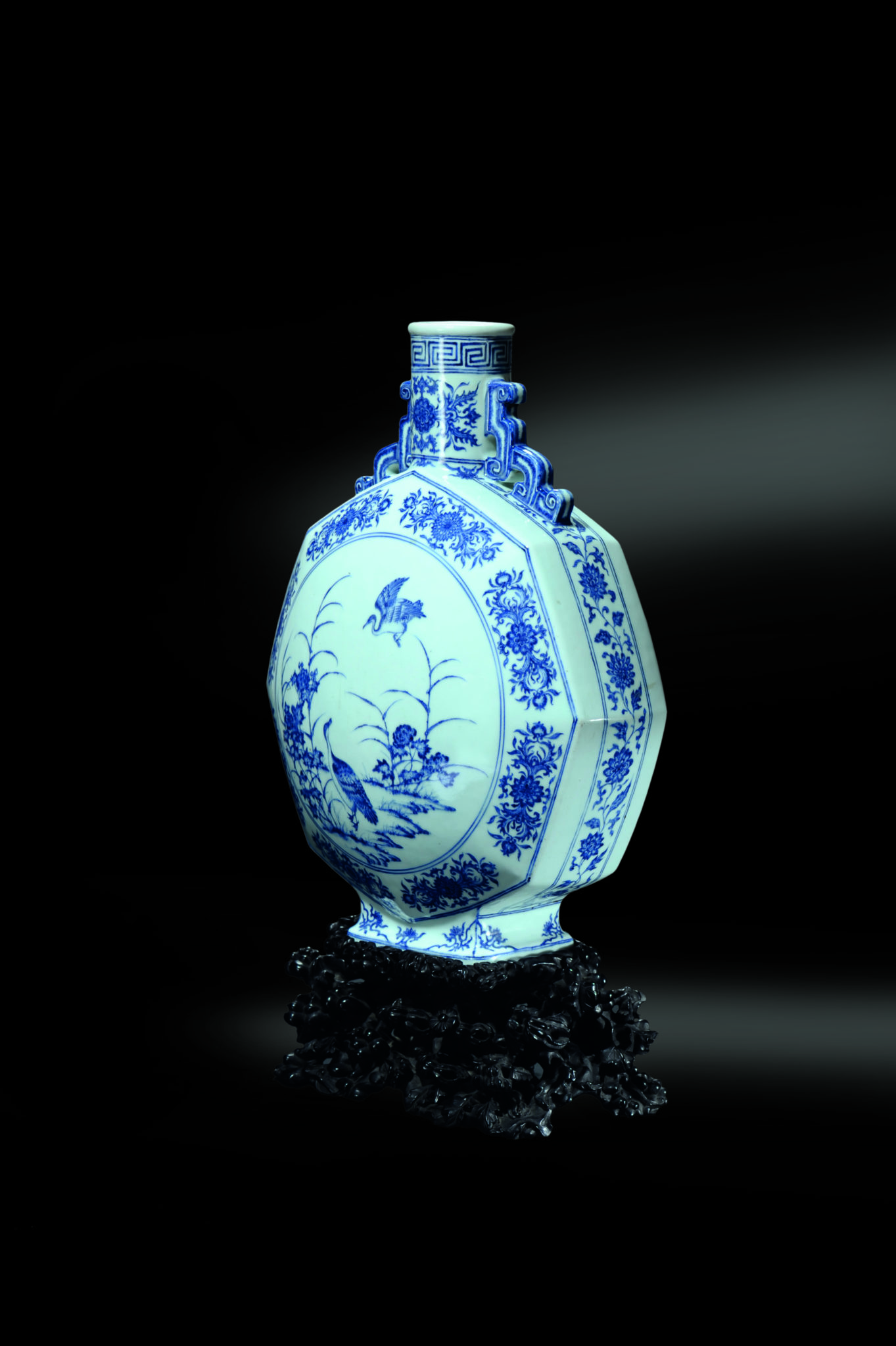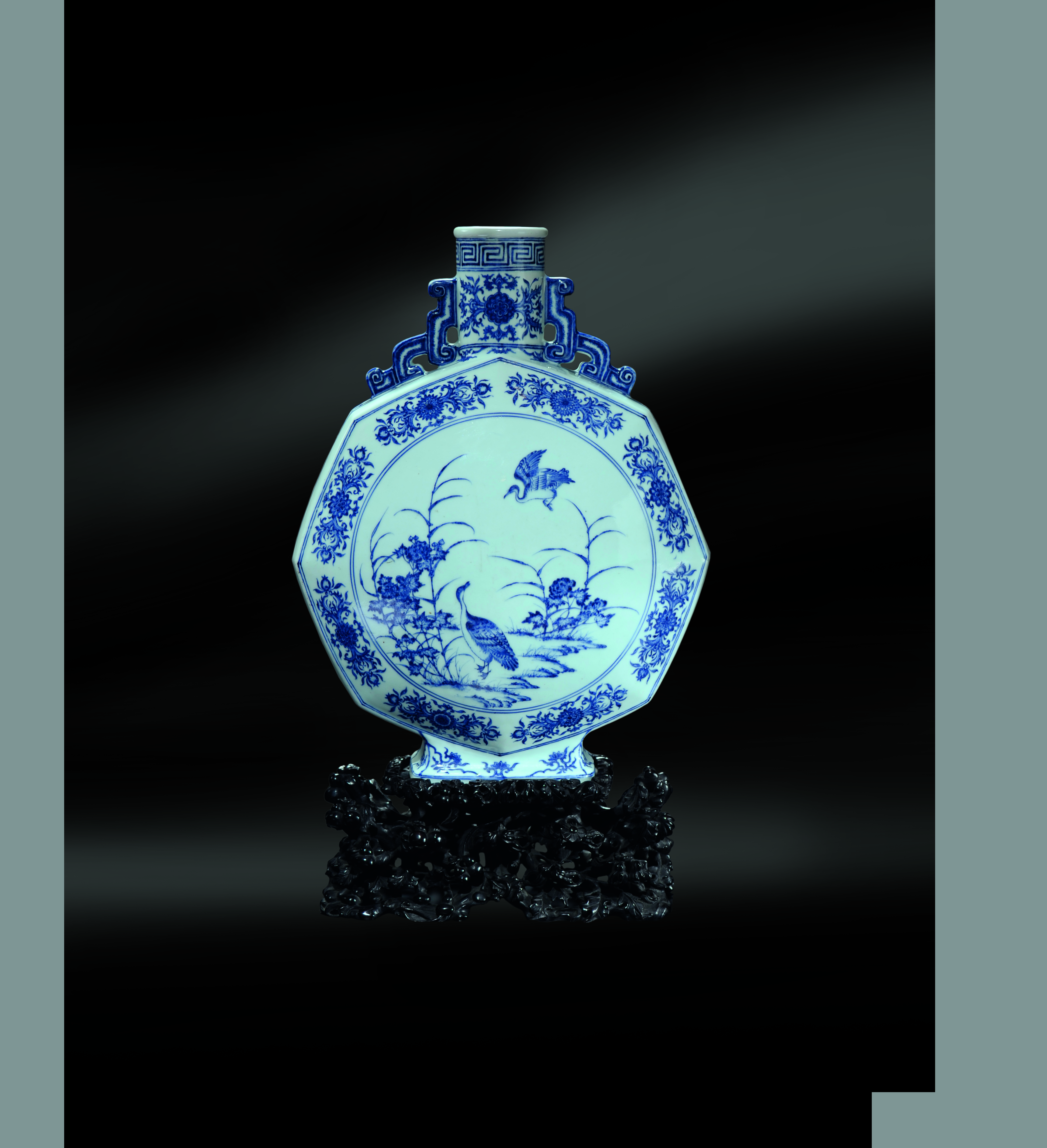 Il disegno delle due riserve deriva da un concetto tipico pittorico Ming, 1500 circa, con lo stile “fiori e uccelli” che era parte della collezione imperiale Qing. Questo genere, di tradizione Song, durante il periodo Ming diventò popolare ed è stato propagato da noti artisti di corte come Lin Liang (attivo 1417- 1780) e Lu Ji (1488-1505). Questi artisti si esprimevano con lo stesso soggetto ma avevano il proprio stile distintivo di pittura. Osservando le pennellate delicate della fiasca della luna si potrebbe considerare un opera connessa ai lavori di Lu Ji. Lo scroll “Airone e Ibiscus”, parte della mostra Possedere il Passato – Te- sori dal Museo Nazionale Palazzo, Metropolitan Museum, New York, 1996, pag. 359, pl. 177, può essere usato come paragone. Vi è una composizione di uccelli dipinti su uno scroll conservato al National Palace Museum che può essere paragonato a questa fiasca della luna: rappresenta una gazza con il becco aperto che guarda il compagno che vola sopra di lei, riflettendo chiaramente il disegno dell’oca la quale, anche qui, ha la testa girata rivolta al compagno nel cielo.