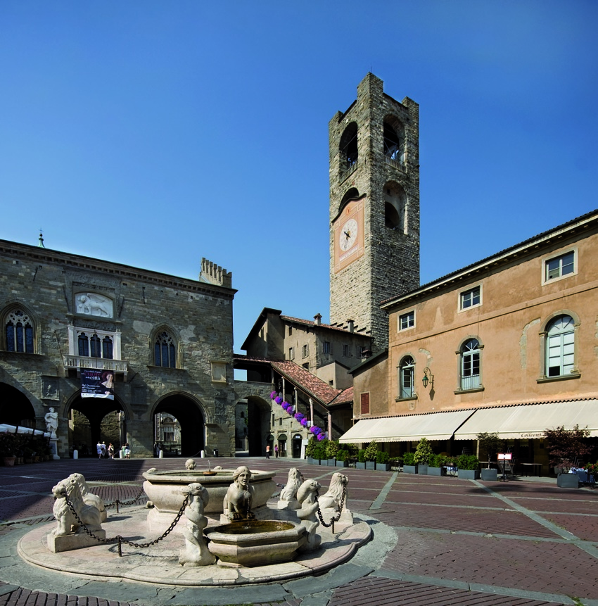 Piazza Vecchia, sede del palazzo del comune, rivestito di marmo e ospite della Biblioteca Civica Angelo Mai. La piazza gode di un sottile accorgimento scenografico che la fa apparire più grande di quanto sia in realtà; questo spazio, cuore della vita politica e amministrativa di Bergamo, incominciò a prendere la forma attuale nel ‘400, e assunse forme e misure rinascimentali con l’inizio della dominazione veneziana, quando l’edificio sul lato occidentale diventò la sede del podestà veneto. La decorazione della facciata fu affidata a uno dei più noti artisti dell’epoca, il Bramante
