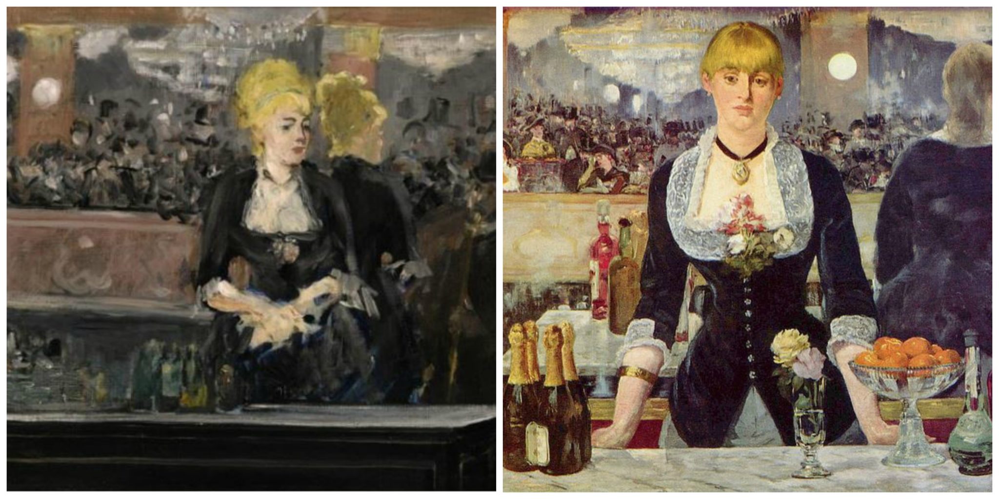 Le indagini scientifiche hanno dimostrato che inizialmente Manet abbozzò sulla tela più grande, quella oggi conservata alla Courtauld Gallery, la stessa composizione della prima versione. Ma successivamente la modificò dando più risalto alla figura della donna e al suo sguardo perso nel vuoto. L’artista immortalò una scena tipica del Bar aux Folies-Bergère, il teatro parigino di varietà, inaugurato nel 1869 in rue Richer. Pantomime, danza, acrobazie, musica, ragazze affascinanti dai sorrisi deliziosi, che diventarono il leit-motiv della Parigi di quegli anni.