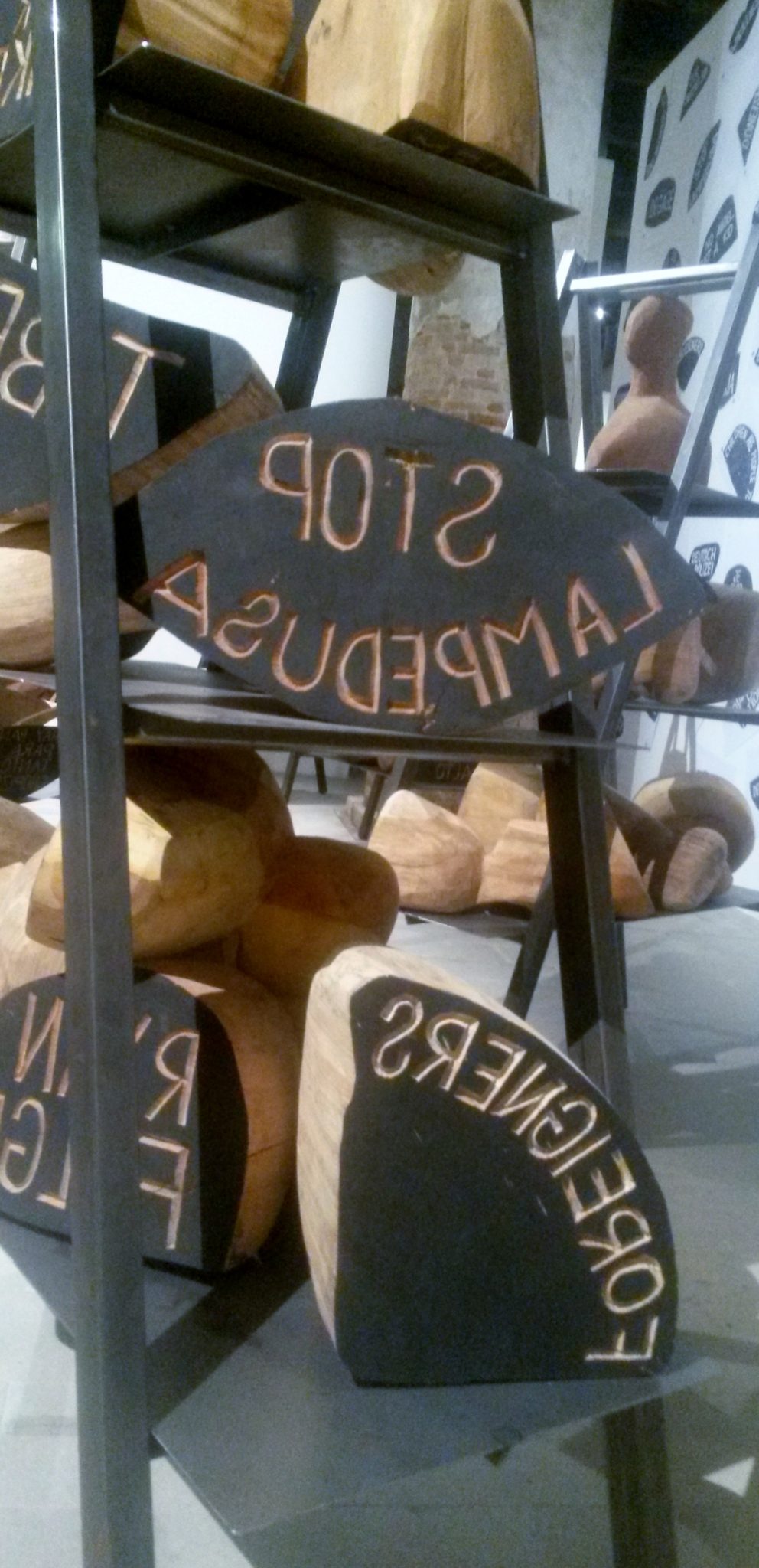 Sociogeografie che tracciano confini psicologici e civili tracciati da spostamenti di gruppi di persone in cammino verso una terra promessa negata. Un percorso che può giungere fino alla disperazione che diventa dispersione e morte nei viaggi della speranza via mare e Mediterraneo in un forma di esilio continuo. Un memento mori collettivo, come ricorda l’opera sentinella di Pino Pascali in Corderie, Il grande cannone di una guerra continua al quale fanno eco le «ninfee» composte da lunghi coltelli conficcati a terra dell’algerino Abdel Abdessemed che s’incontrano entrando insieme alla scritta al neon Death del veterano Bruce Nauman.