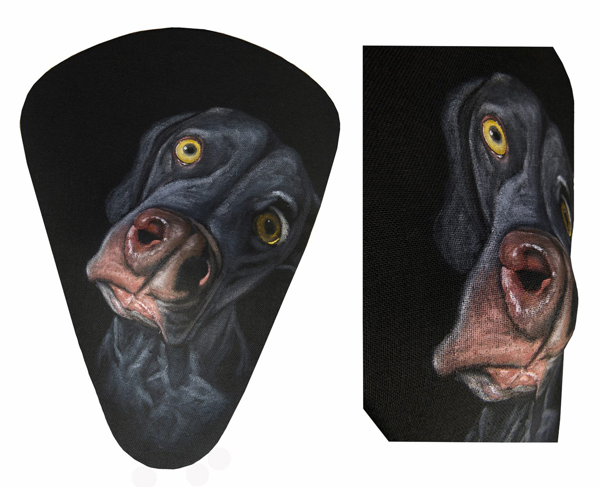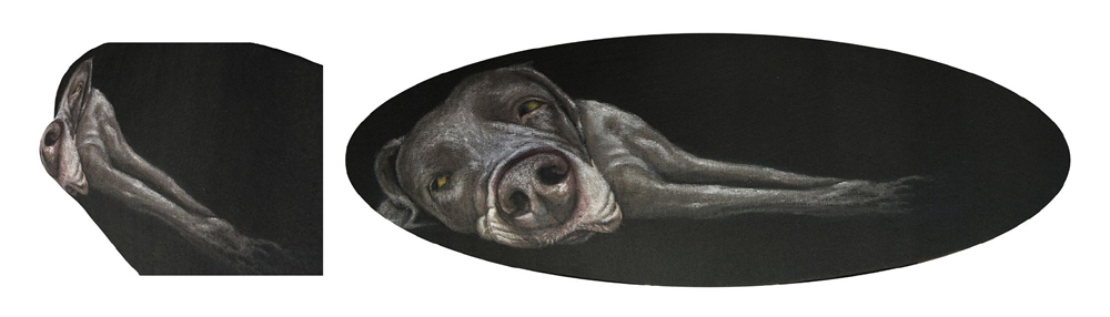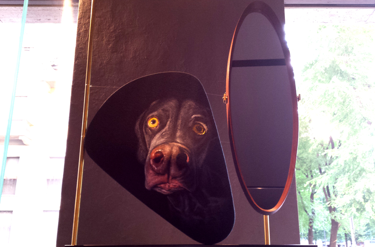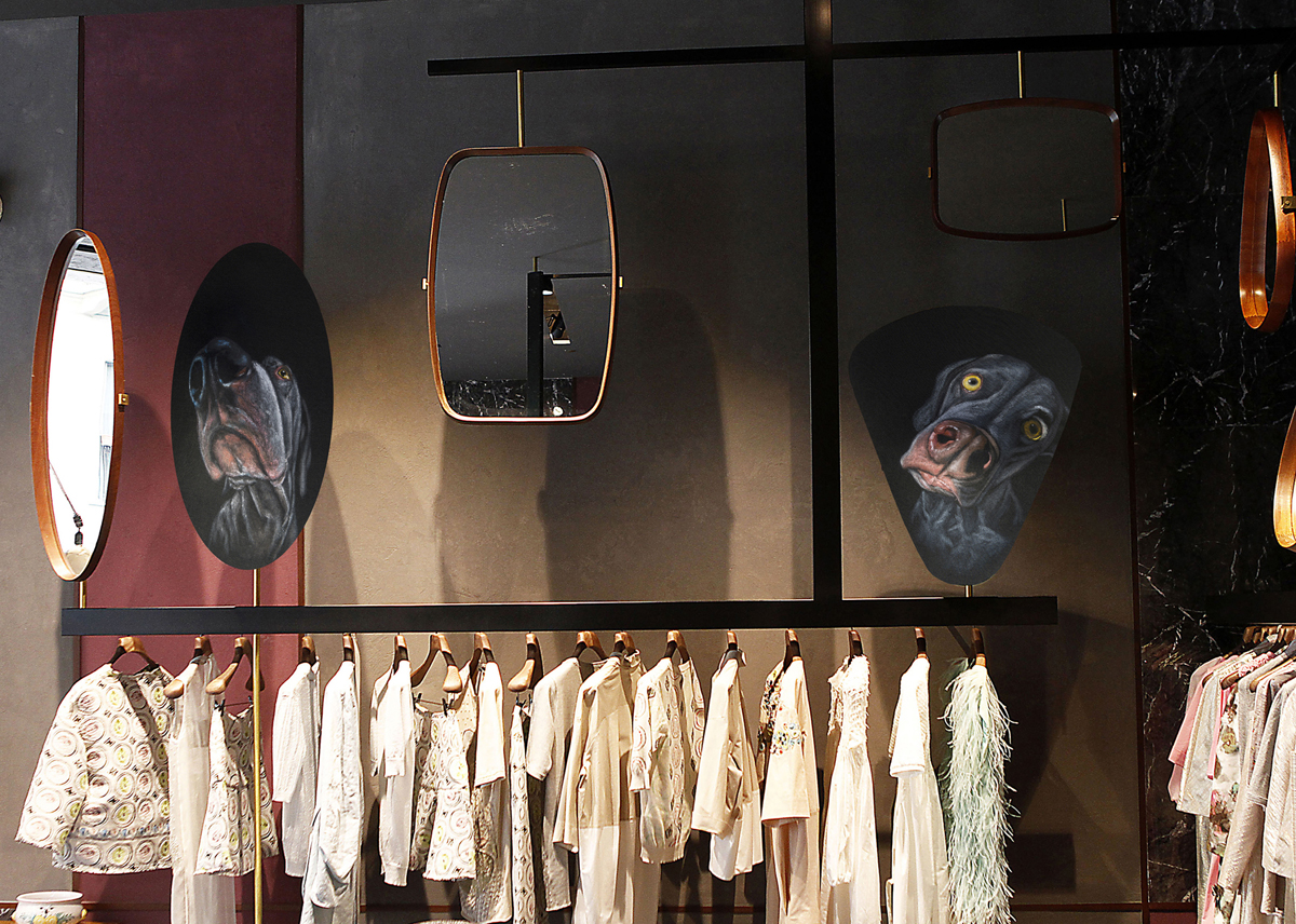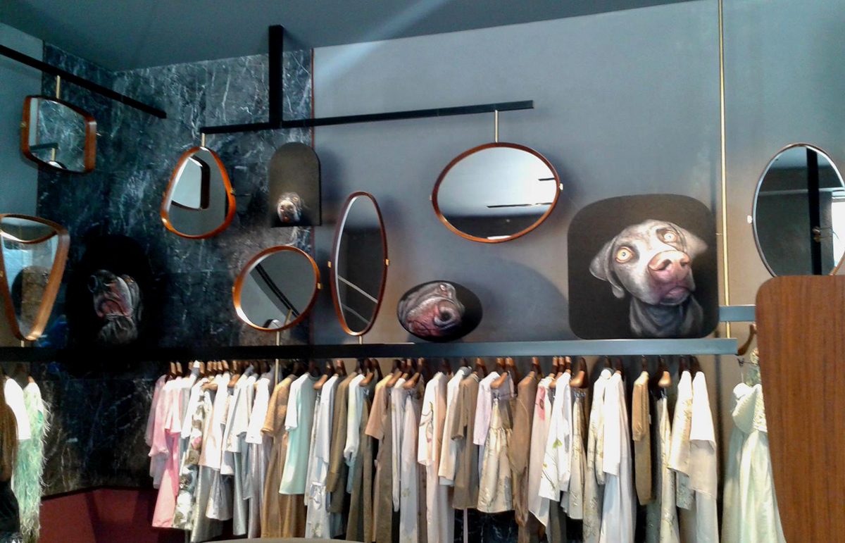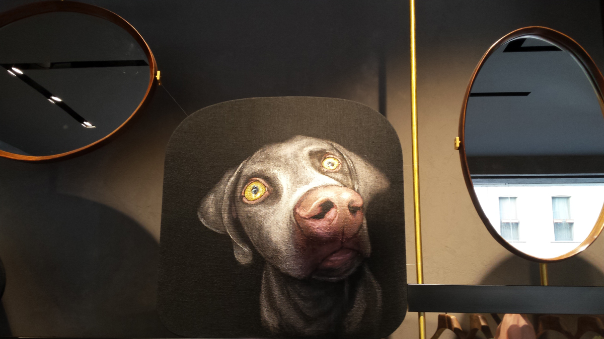 Le tele tirate e costruite artigianalmente una ad una, così, seguono e accompagnano il ritmo degli specchi ellittici e poligonali (sempre dagli angoli smussati e con sottili cornici in legno curvato) che fregiano le pareti alternandosi. Note di uno spartito fatto di specchi e di faccioni canini estroflessi che guardano i marmi e gli ottoni da basso. Un gioco di sguardi e riflessi che rimbalza dalle iridi gialle e azzurre dei Bracchi di Weimar alle raffinatezze degli abiti geometricamente specchiati appesi in giro. Una sinfonia di arte e moda, sete e juta, che – in occasioni come questa – dà i suoi frutti (d’autore) migliori. E una maglietta! Prendendo spunto dalle opere dell’artista, infatti, Maurizio Pecoraro ha realizzato per l’occasione una t-shirt, con i “Conti di Weimar” di Cariati, unica a edizione limitata e numerata… e ovviamente estroflessa!