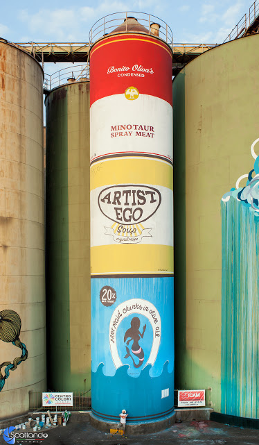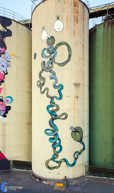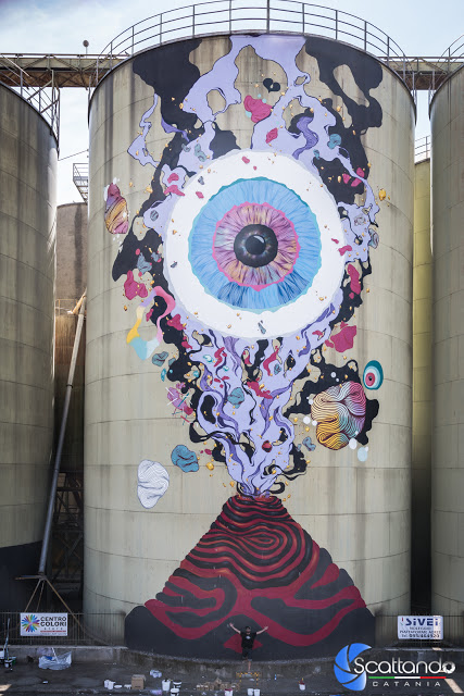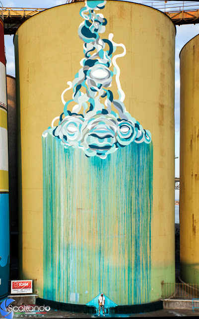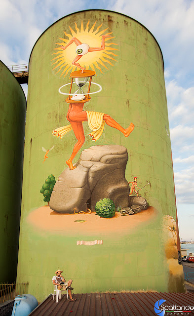 Street Art Silos: il Mediterraneo e le sue identità millenarie scorrono a colori sui silos del Porto di Catania.Centotrenta ore di lavoro, alcune persino in notturna. Mille chili di colore, 700 bombolette spray per raccontare sui silos del Porto di Catania l’identità della Sicilia attraverso i suoi miti, comuni alla madrepatria Grecia: da Ulisse a Colapesce, da Scilla e Cariddi a Polifemo, dal Minotauro all’ironia di una sirenetta sott’olio, ovviamente d’oliva, altro elemento identitario del Mediterraneo.