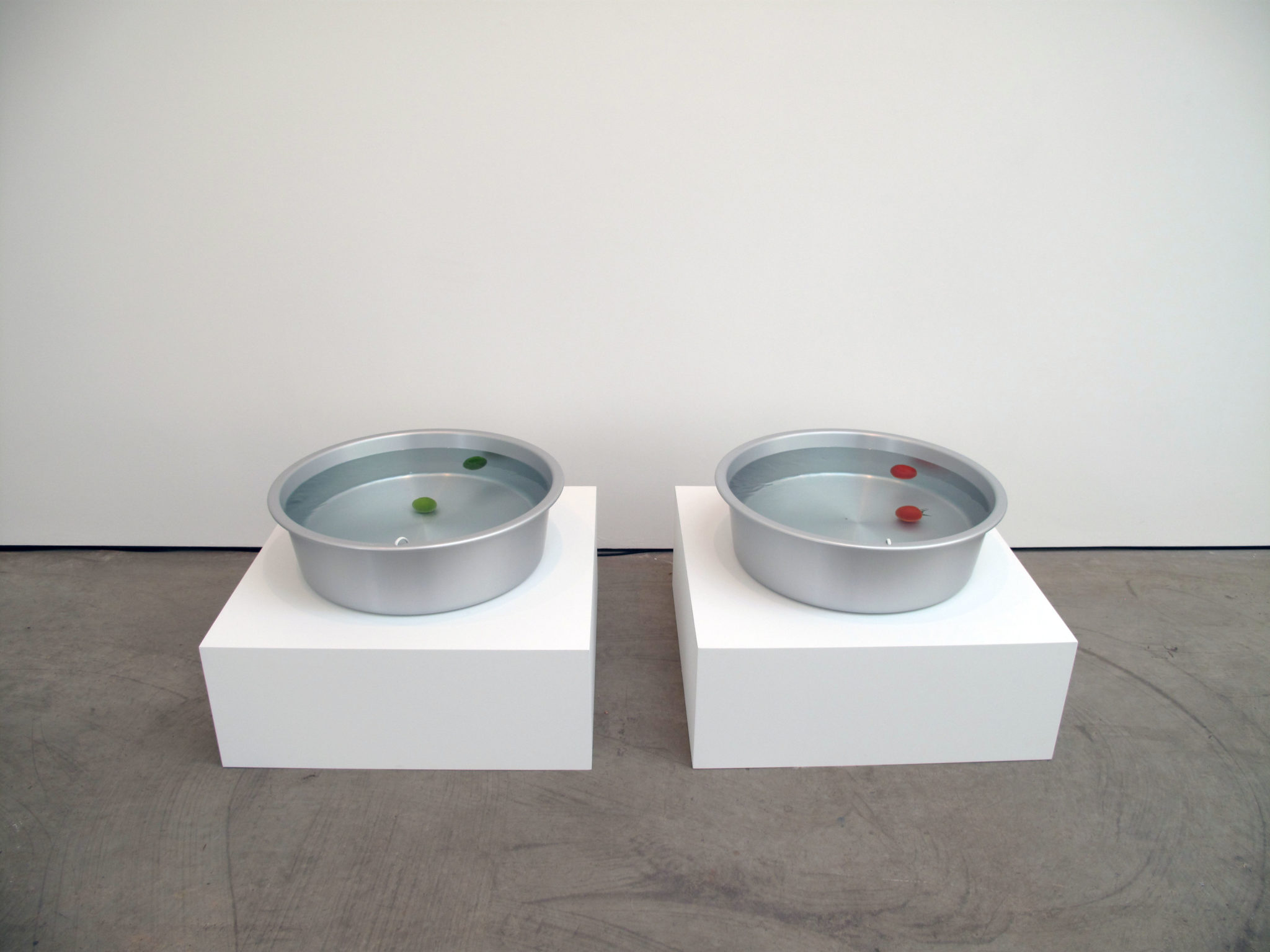 2 bacinelle di alluminio, acqua, 2 pomodori, 2 lime, 2 piedistalli, 2 pompe d’acqua / cm 30 x 80 x 80 (piedistallo); cm 119 x 60 (bacinella)