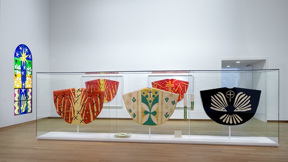 E la mostra è un’Oasi nell’Oasi. Nelle ultime sale della mostra,troneggiano le grandi opere sintetiche, ma nel percorso sono presenti anche collage, tra cui opere monumentali, un meraviglioso tappeto, costumi teatrali, e abiti da prelati per Saint Paul de Vence, colorati, gioiosi, che per un italiano uso a vedere gli abiti del nostro clero dal vivo e nei musei, sono sorprendentemente gioiosi e contemporanei.