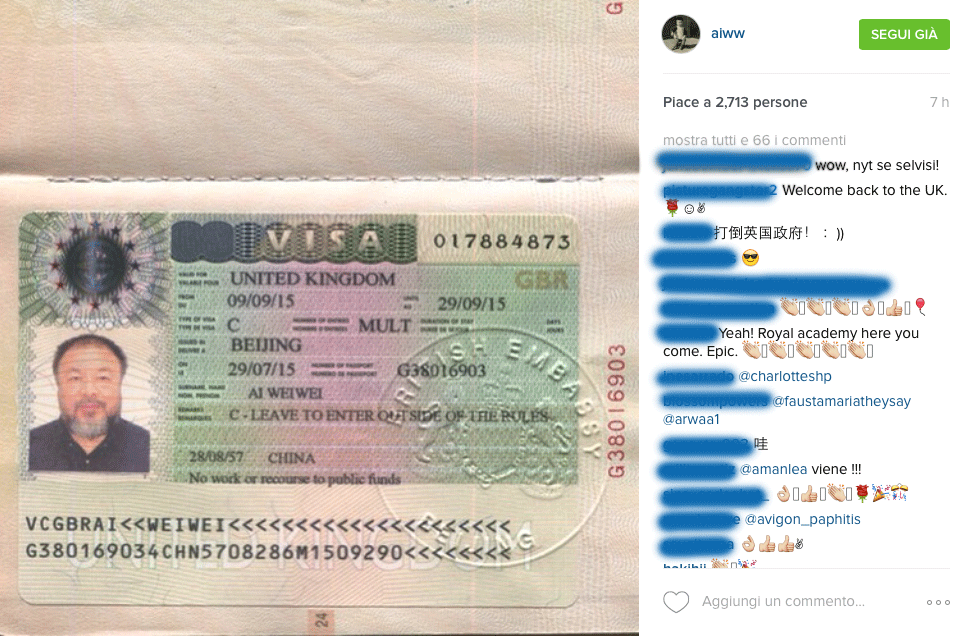 Gli è stato comunque concesso un visto di 20 giorni (9 – 29 settembre 2015), per partecipare all’inaugurazione della sua mostra alla Royal Academy of Arts di Londra, che si aprirà il prossimo 19 settembre.