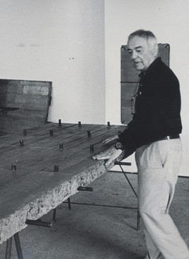 “Io lavoro con il cemento e il ferro. Questi materiali li uso con proprietà, nel senso che non li camuffo, che non me ne servo per trarre degli effetti particolari, al contrario li adopero come si adoperano nei cantieri, per costruire le case, i ponti e le strade, per costruire tutte le cose di cui l’uomo ha bisogno. Alla base di tutto questo c’è la necessità di costruire, di organizzarsi, c’è quel principio creativo che è all’origine di ogni progresso umano, questo è quanto nei miei oggetti voglio esprimere”.