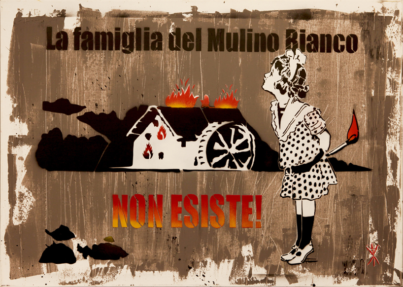 Una “decostruzione e ricostruzione dei codici linguistici” che Mr. Savethewall opera attraverso le modalità e le tecniche di intervento della Street Art, in primis l’utilizzo dello stencil su supporti di derivazione urbana e di largo consumo come cartone, carta da pacchi, legno, metallo, materiale di riciclo.